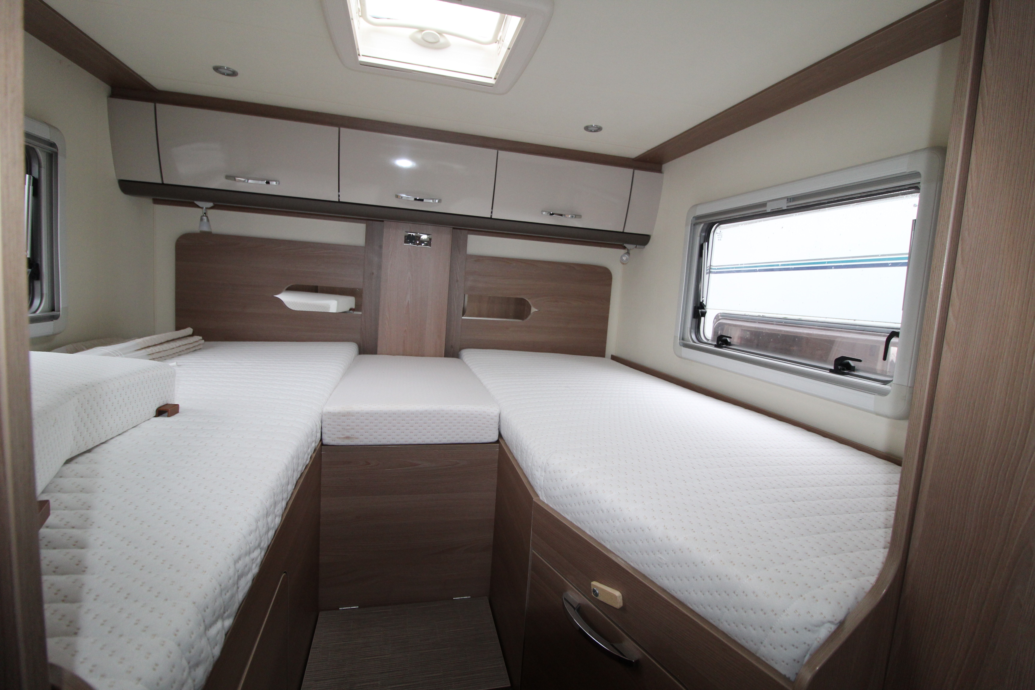 The main bedroom area provides 2 large single beds or one large double when adding the infill. Overhead lockers and storage cupboards below can store your items away securely.