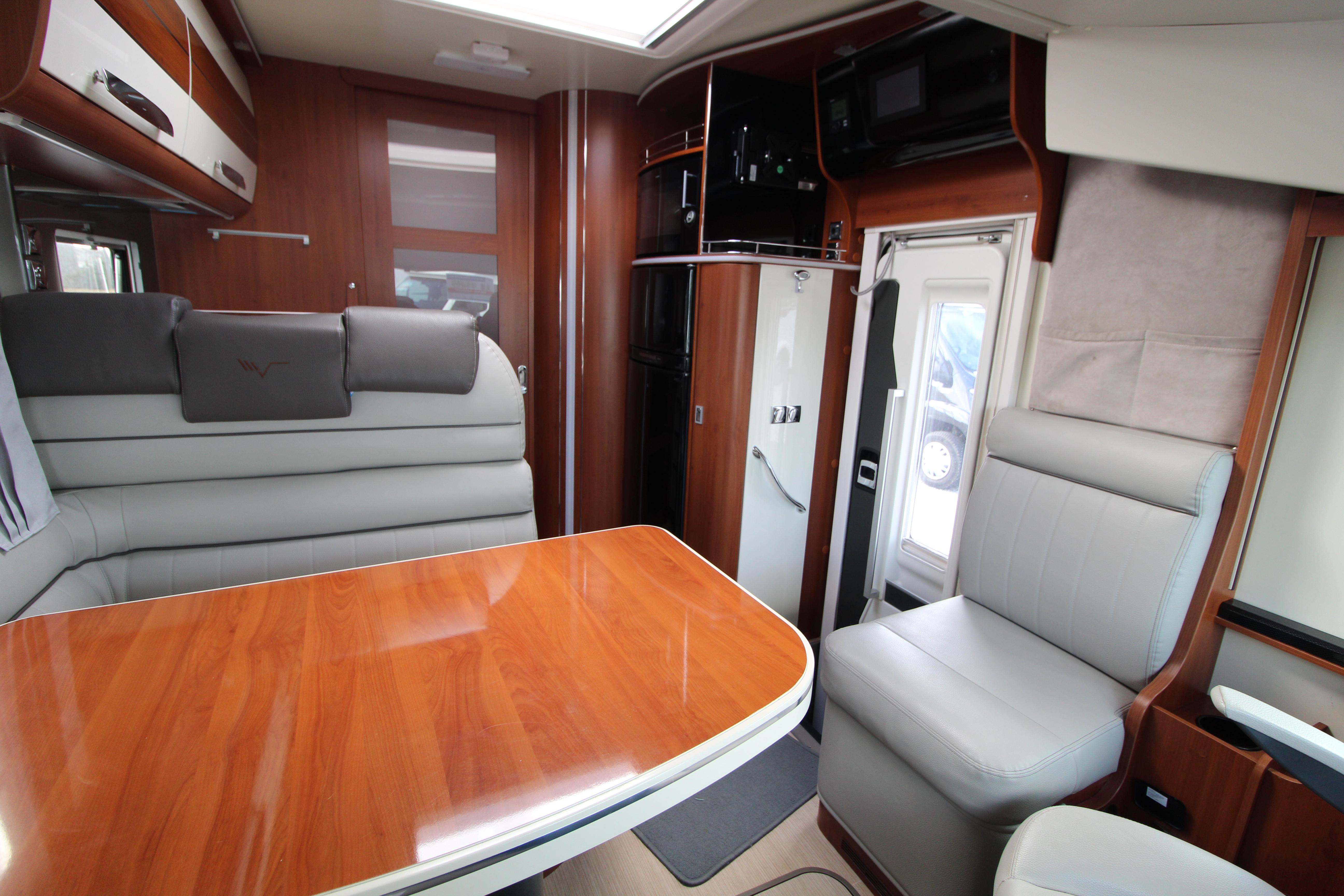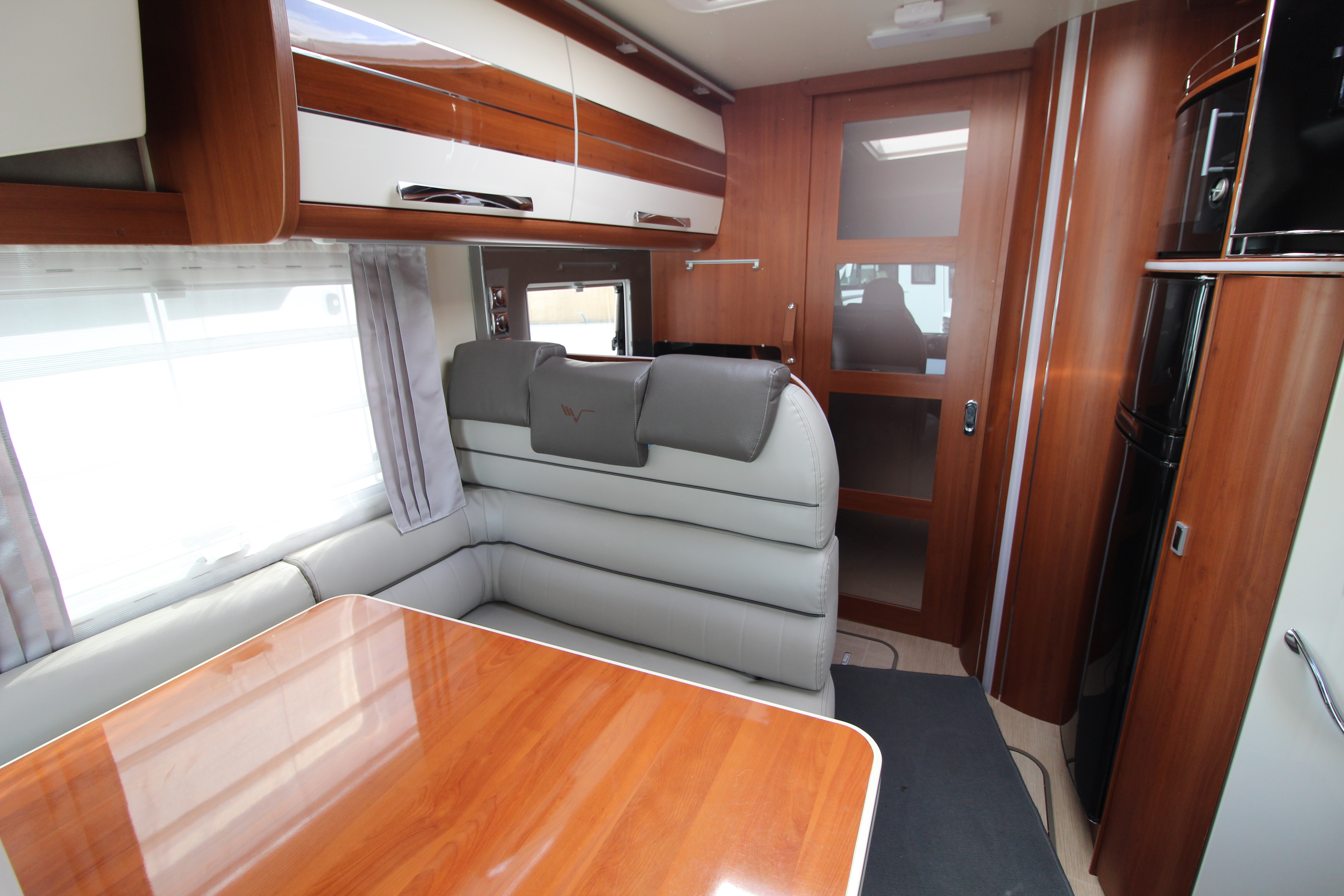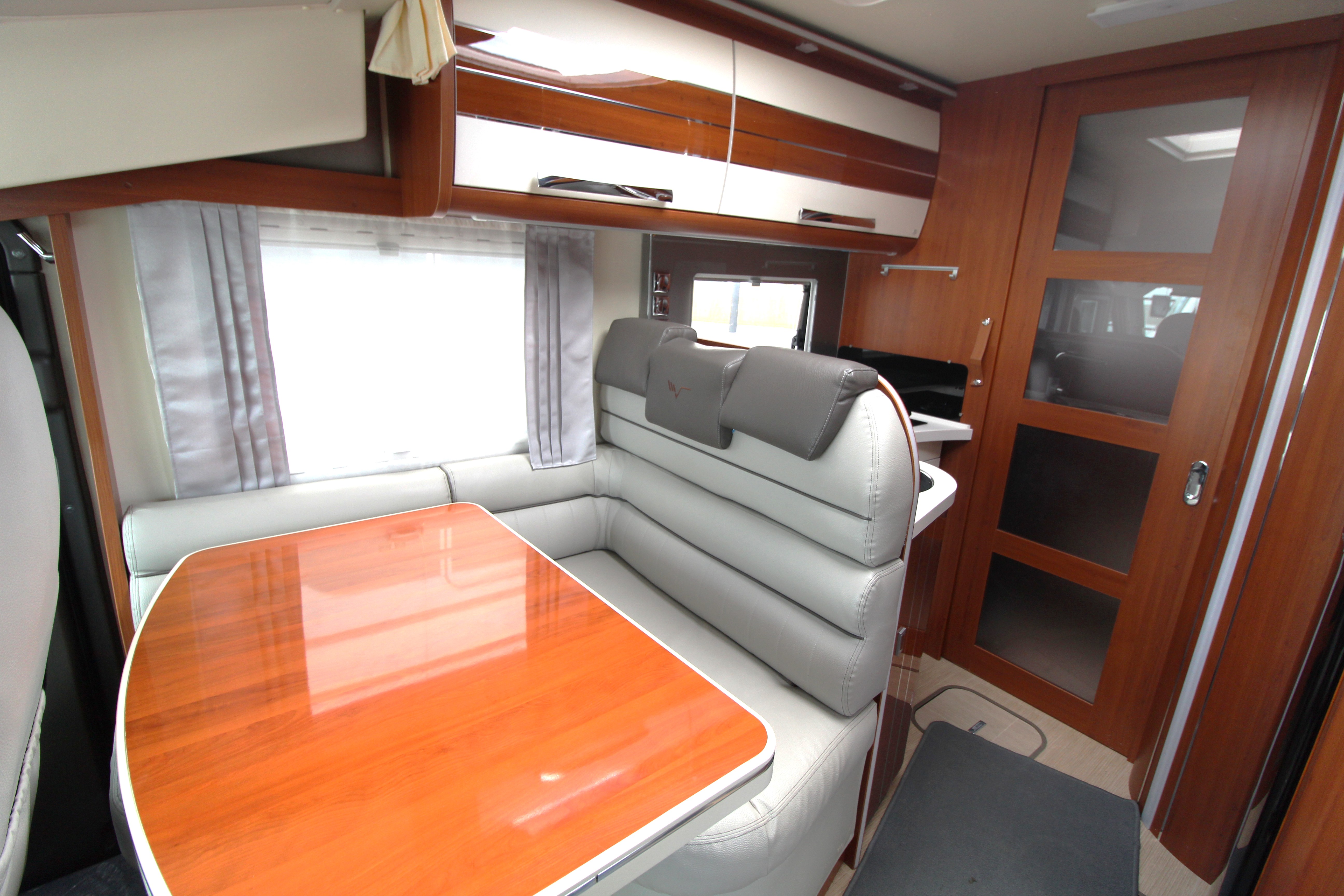 "Marine" Lounge: High-gloss furniture paired with elegant Comfort Grey eco-leather upholstery and a 360° rotating table. Providing a sumptuous lounge area with L-shaped seating, side bench and swivel cab seats make this a superb area for relaxing or hosting guests.