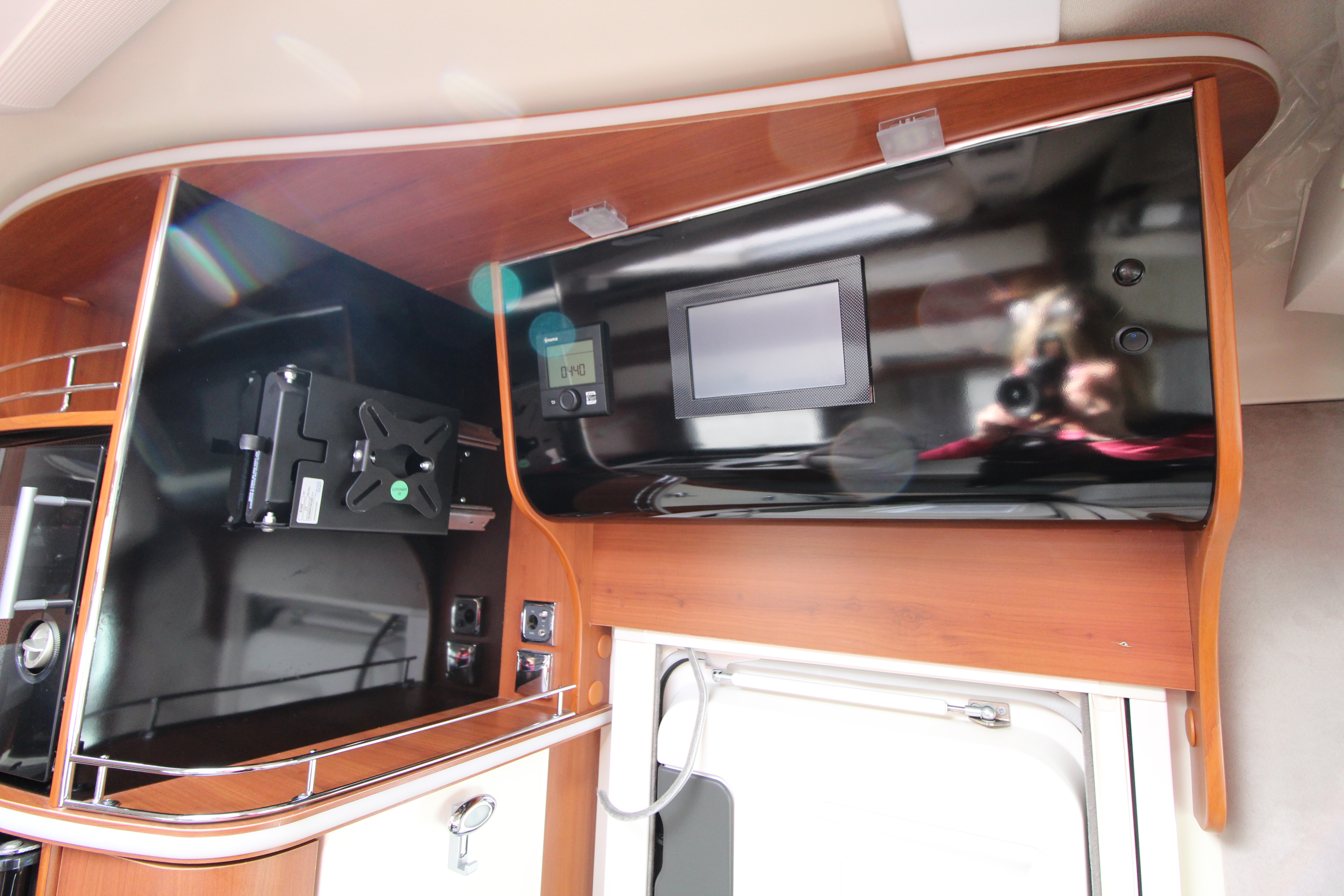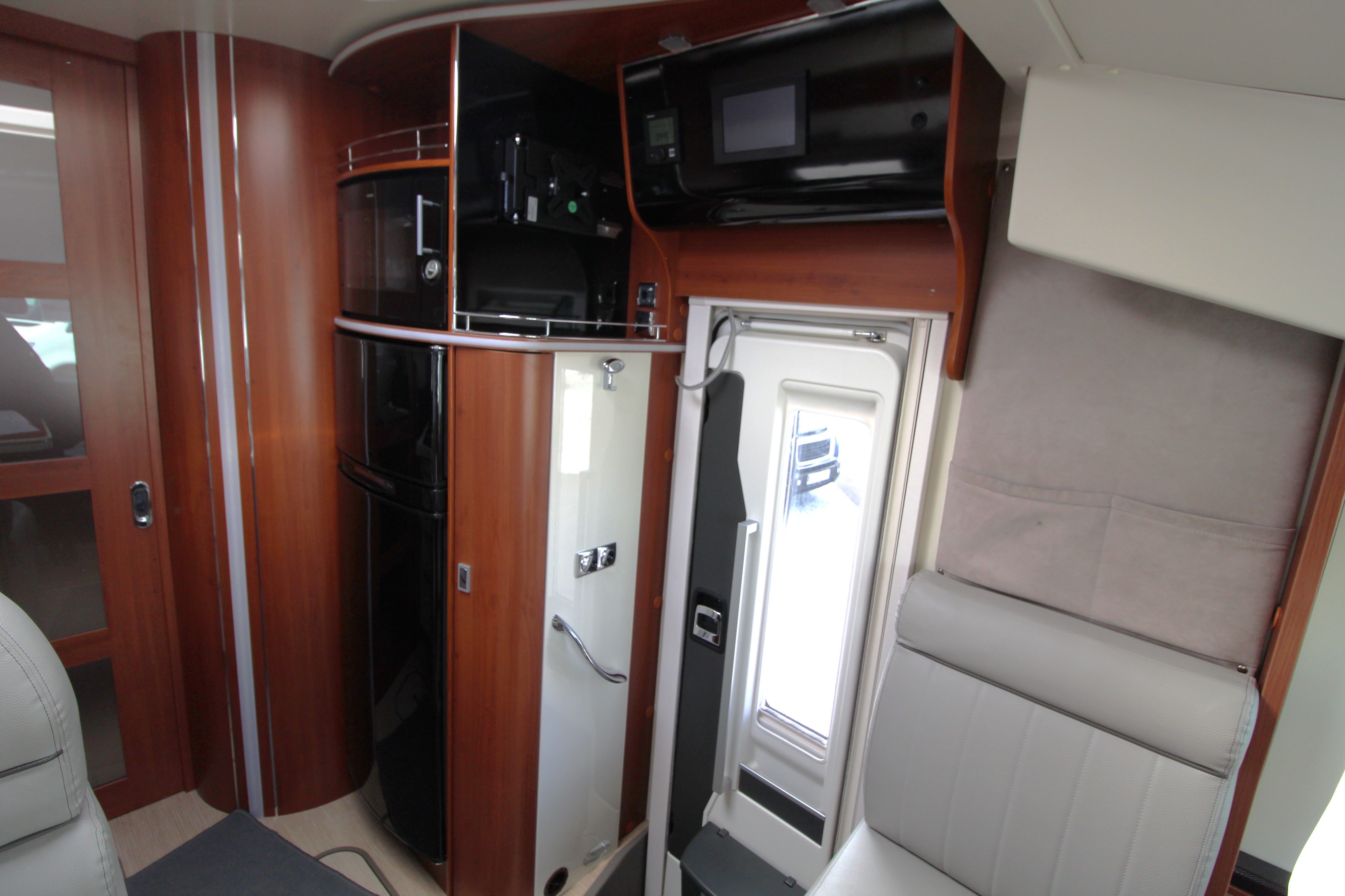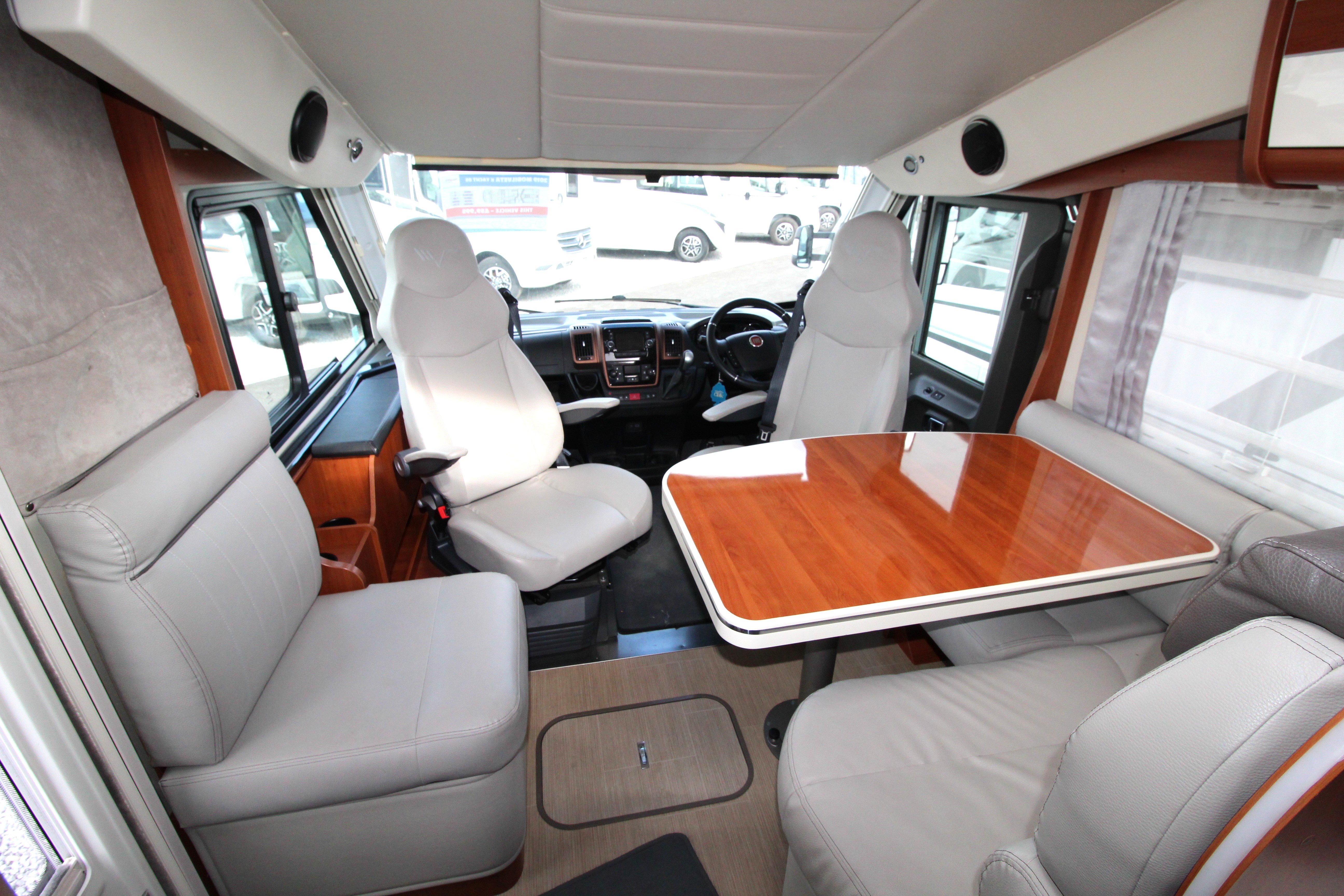 "Marine" Lounge: High-gloss furniture paired with elegant Comfort Grey eco-leather upholstery and a 360° rotating table. Providing a sumptuous lounge area with L-shaped seating, side bench and swivel cab seats make this a superb area for relaxing or hosting guests.