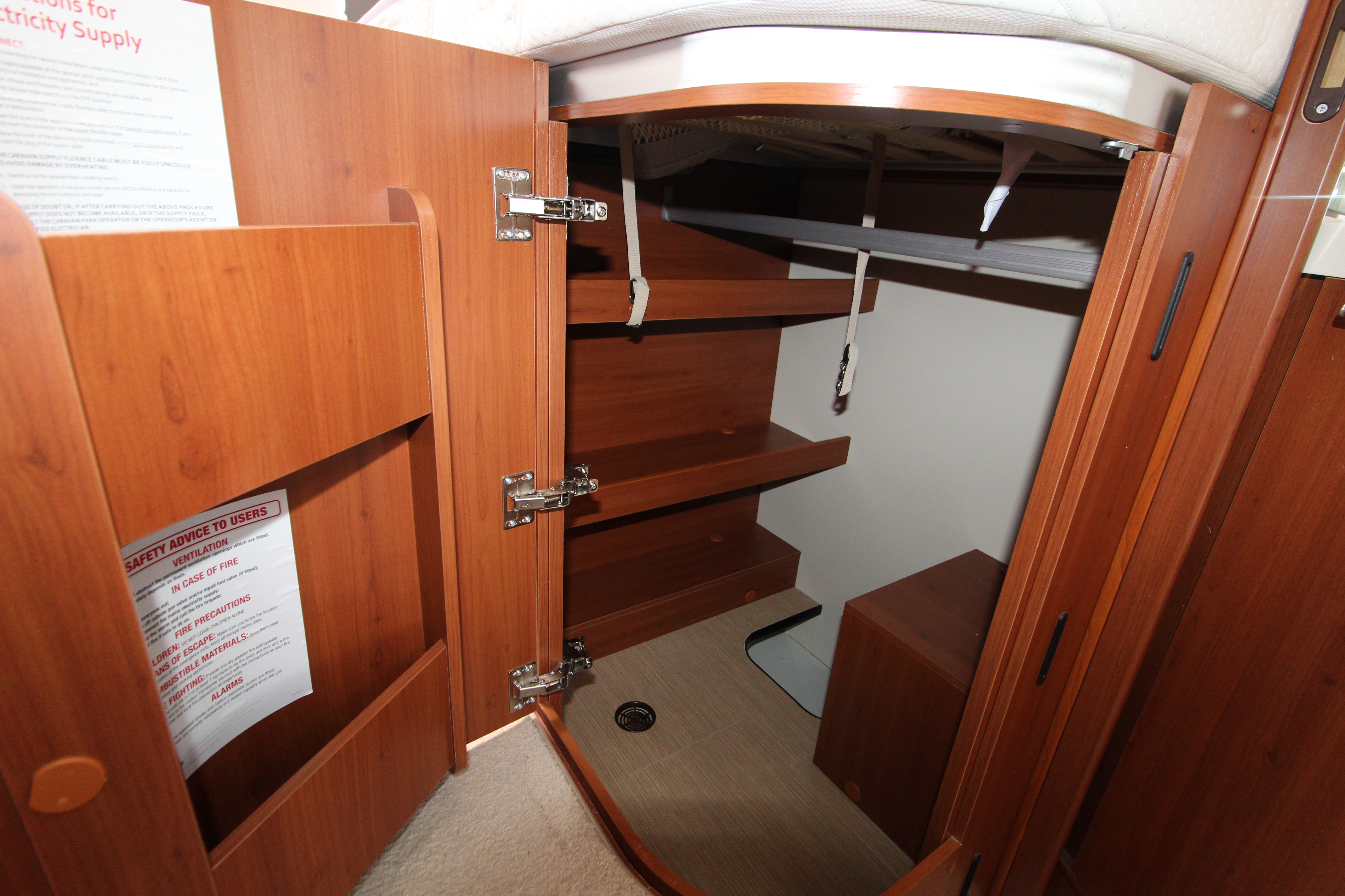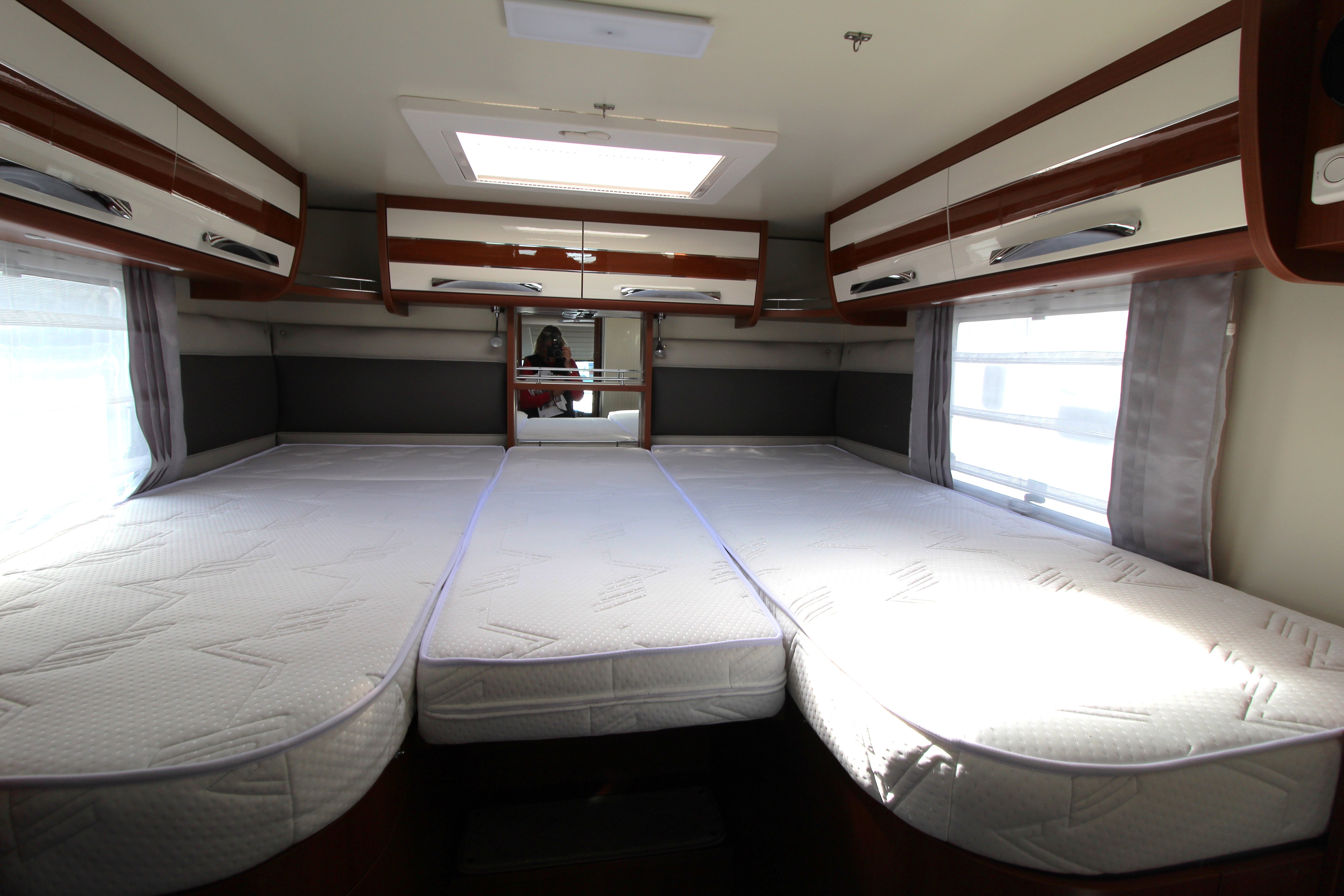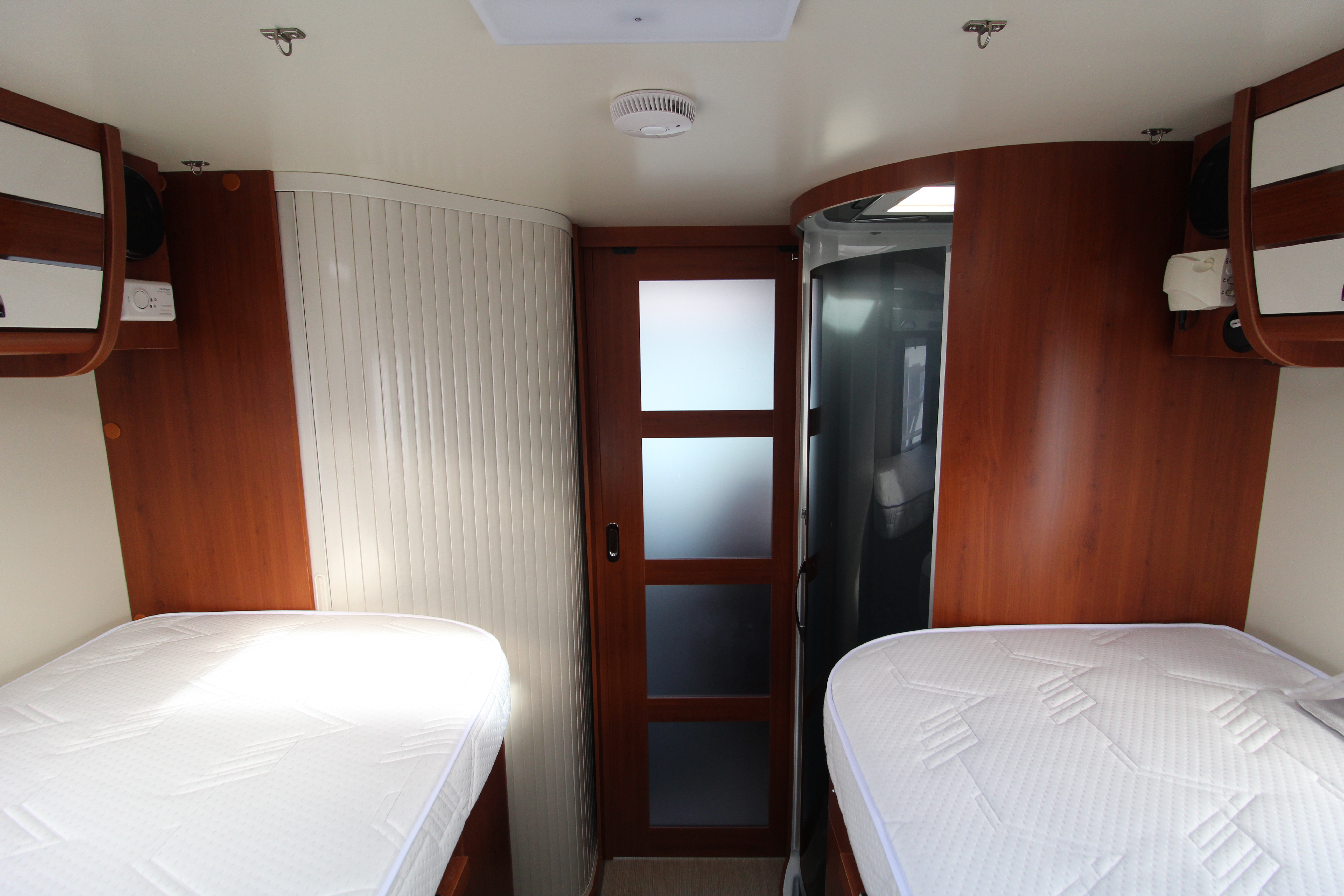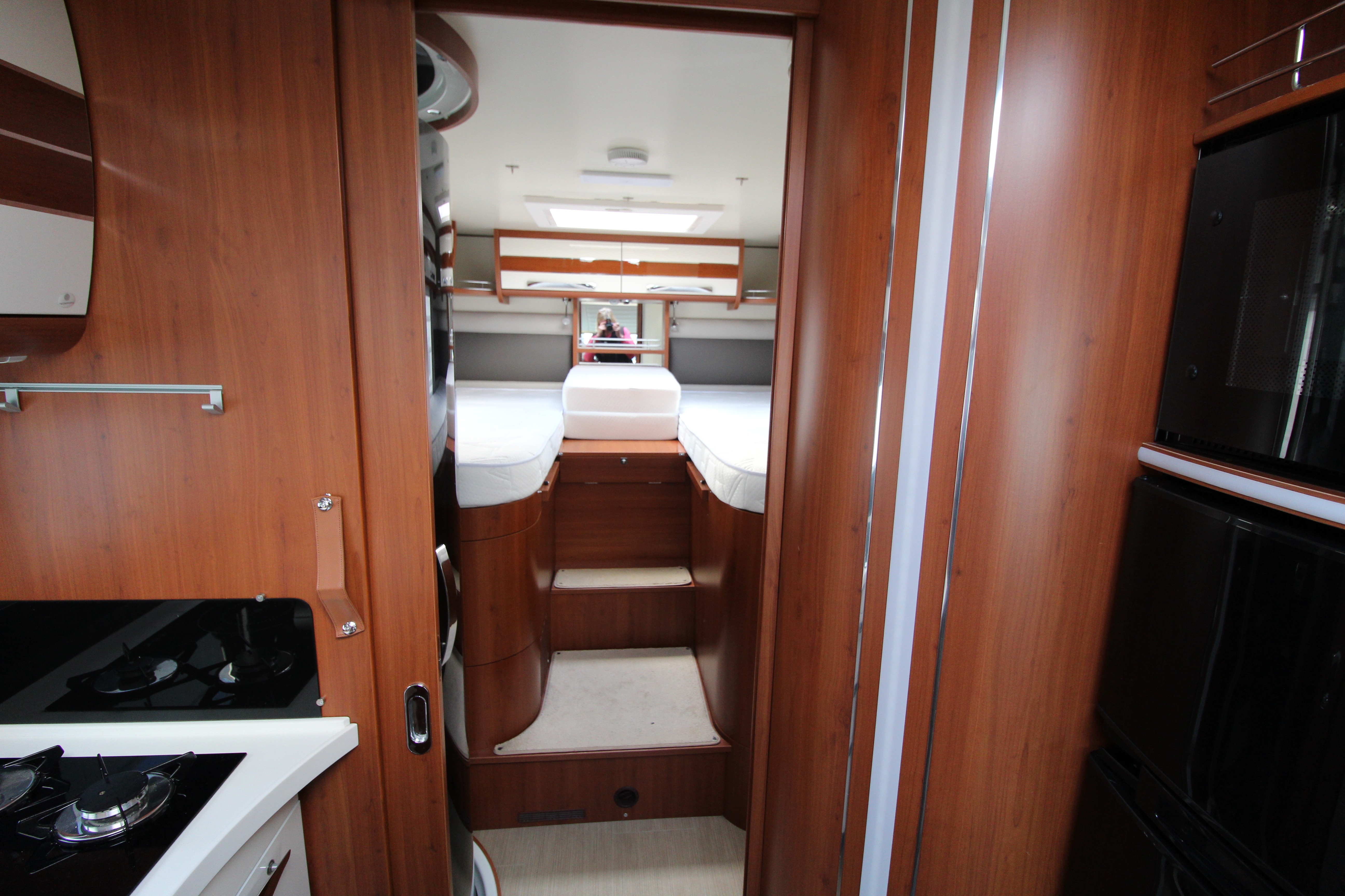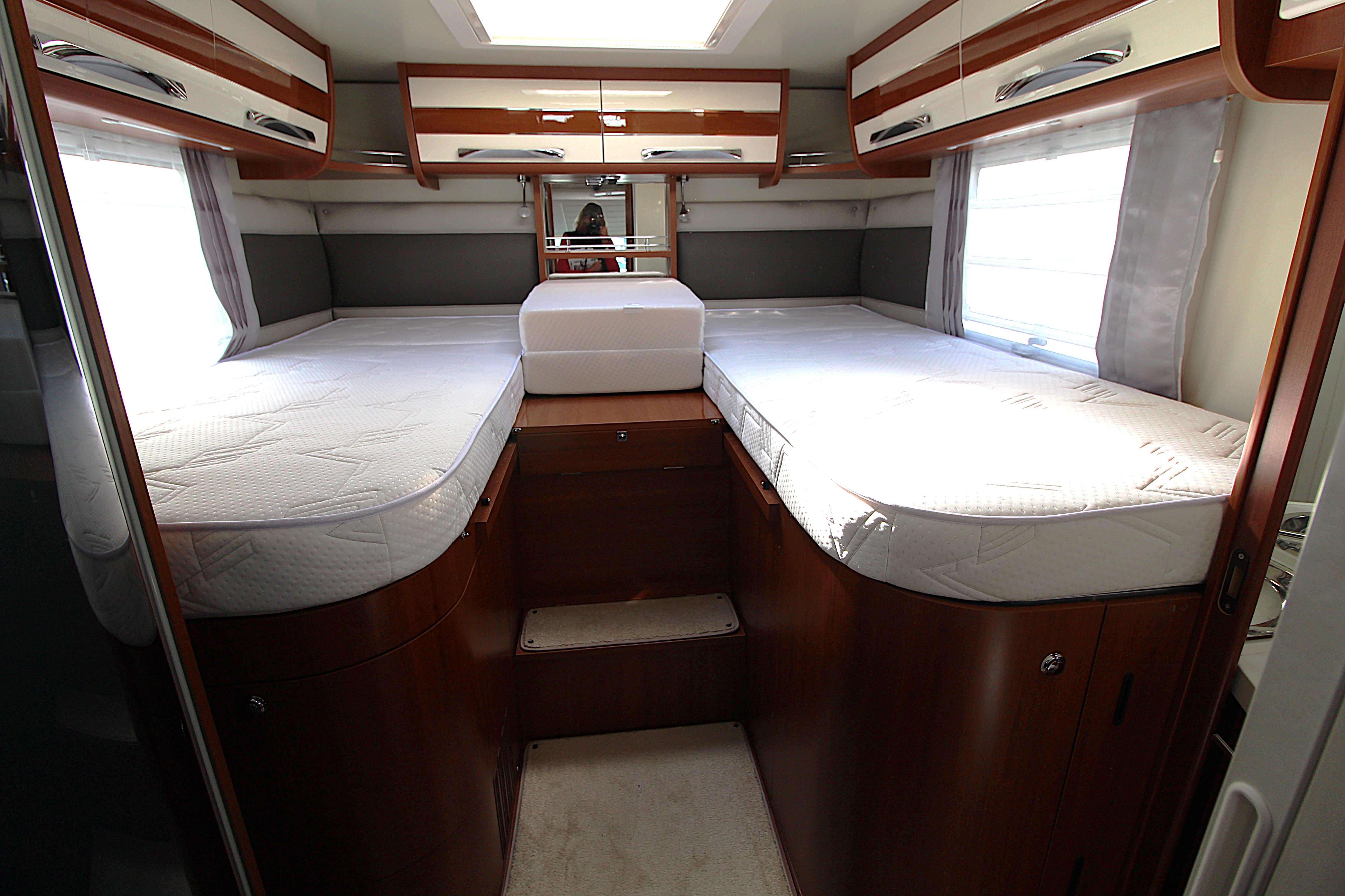 Features high-level fixed twin single beds at the rear, easily converted into a large double with an infill cushion.