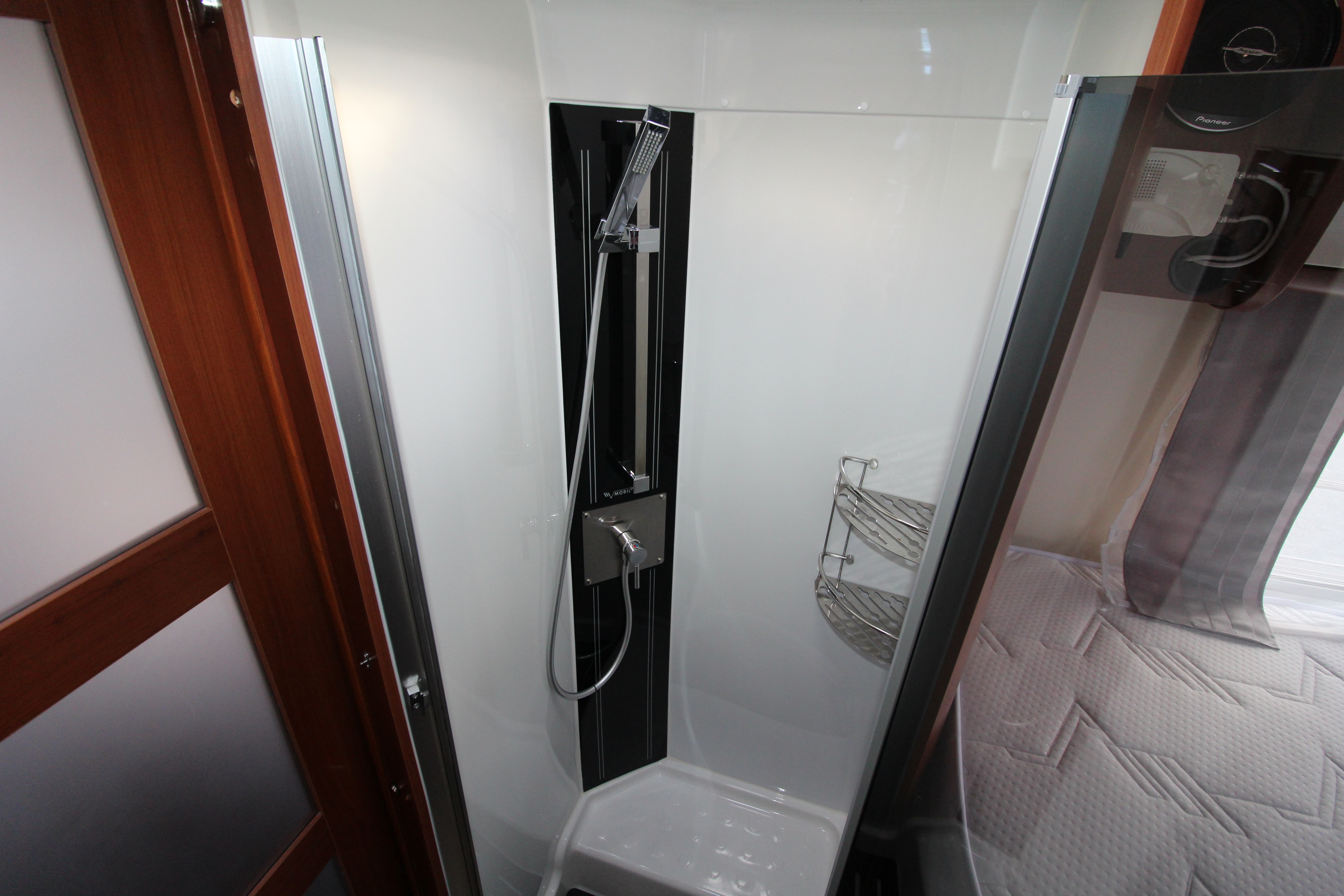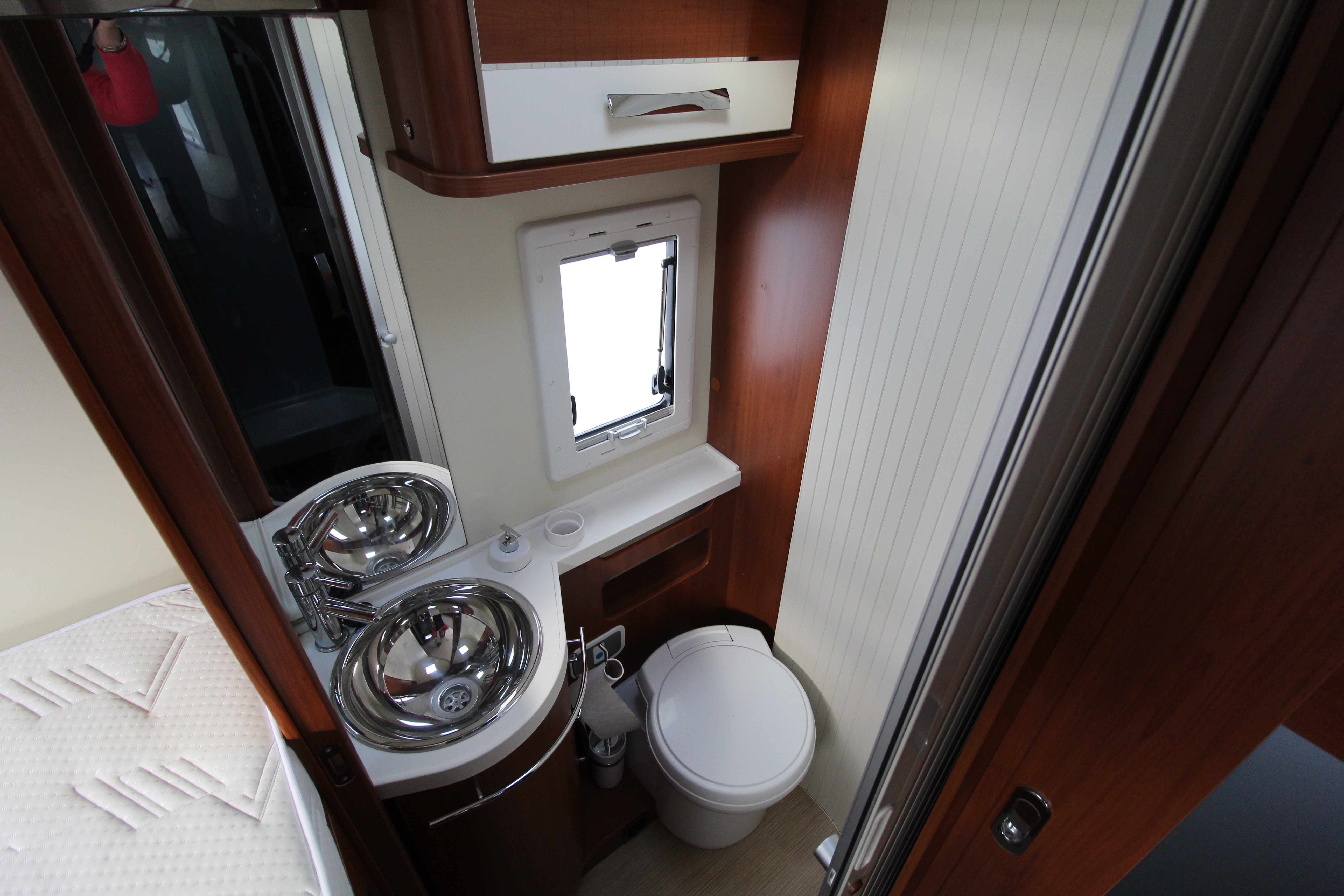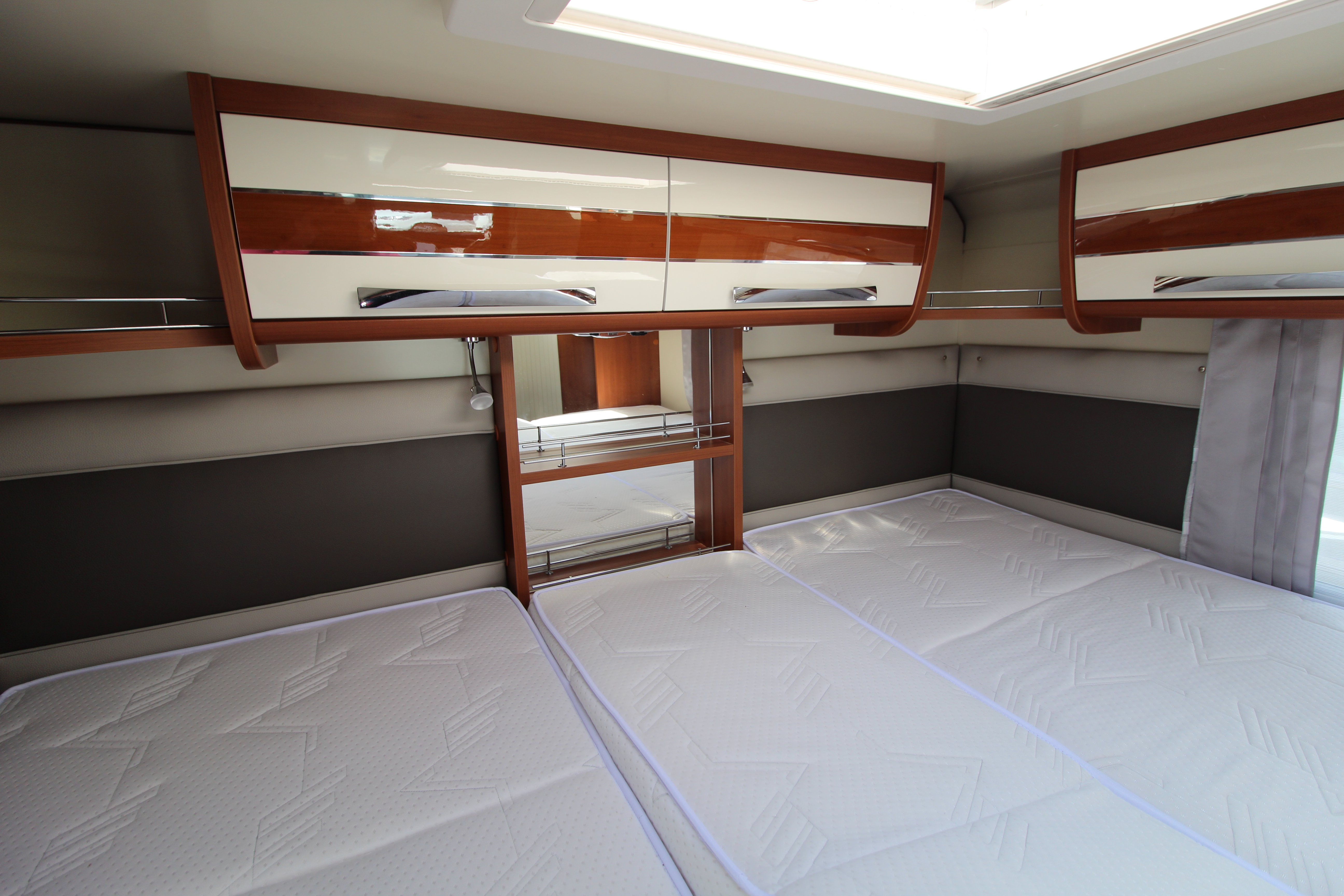 Mid-ship split-facilities can be used as en-suite or partitioned for complete privacy. A separate, spacious shower cubicle to one side and a vanity unit with washbasin and chrome fittings, cassette toilet and cabinets to the other.