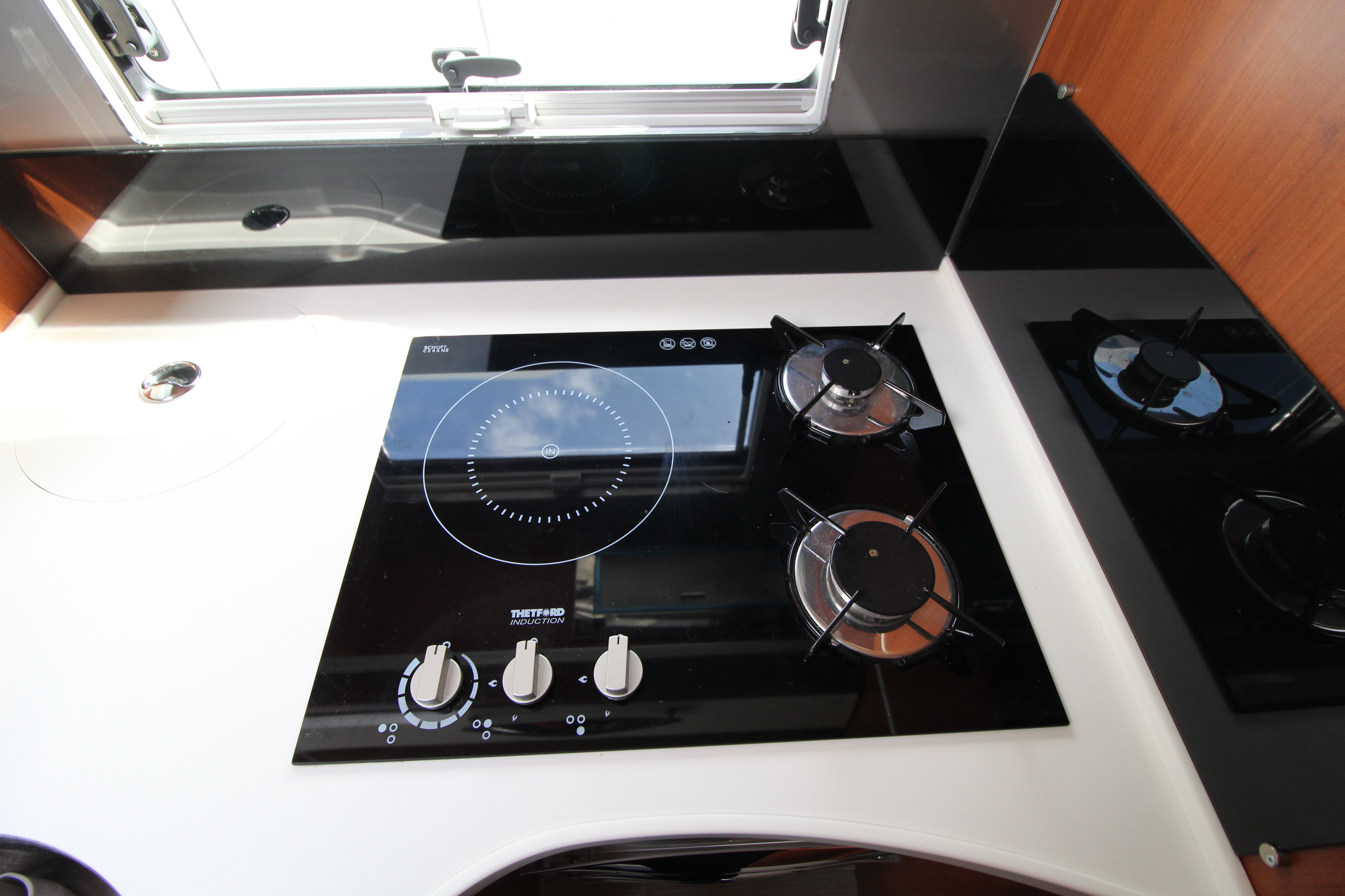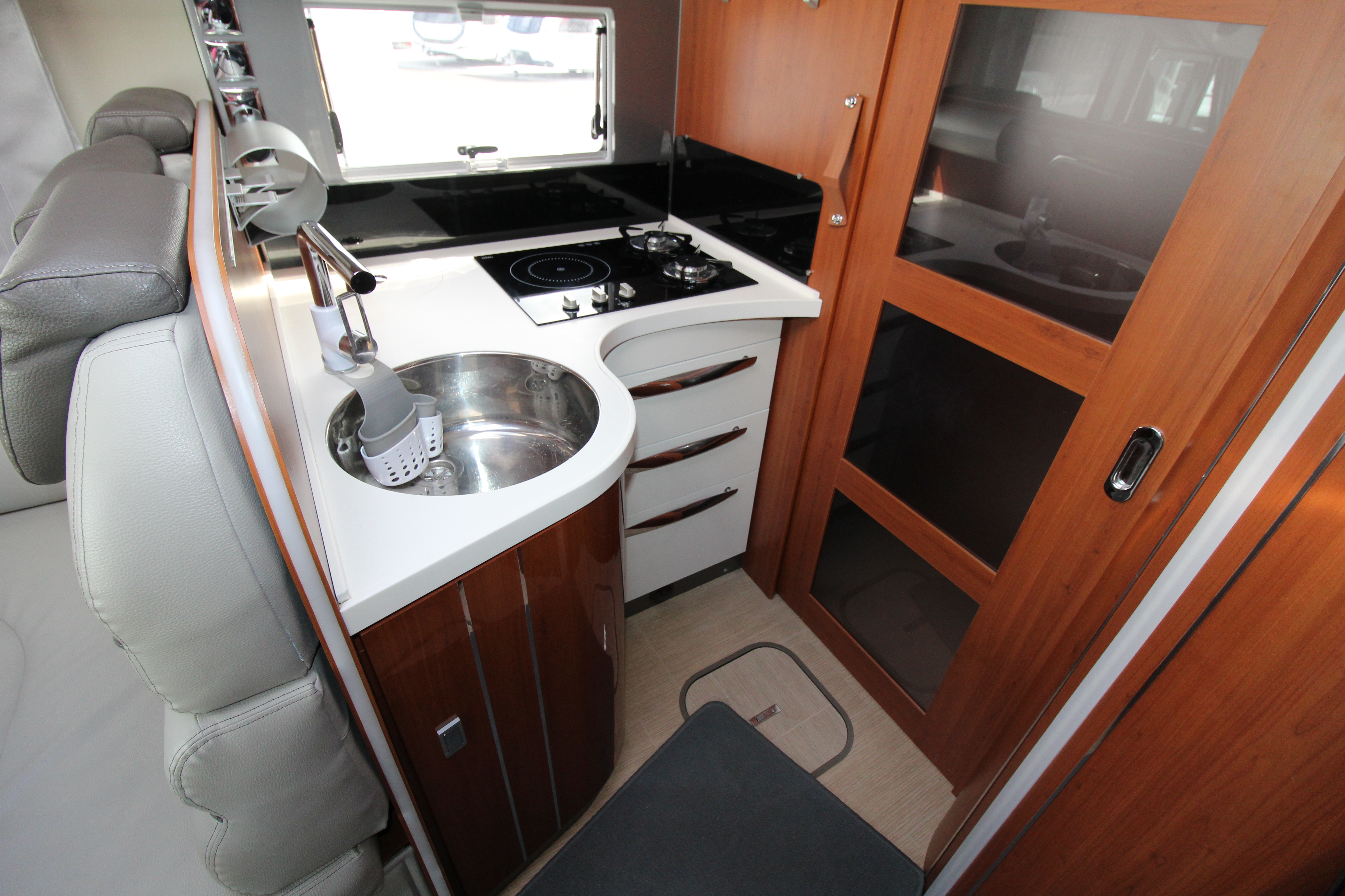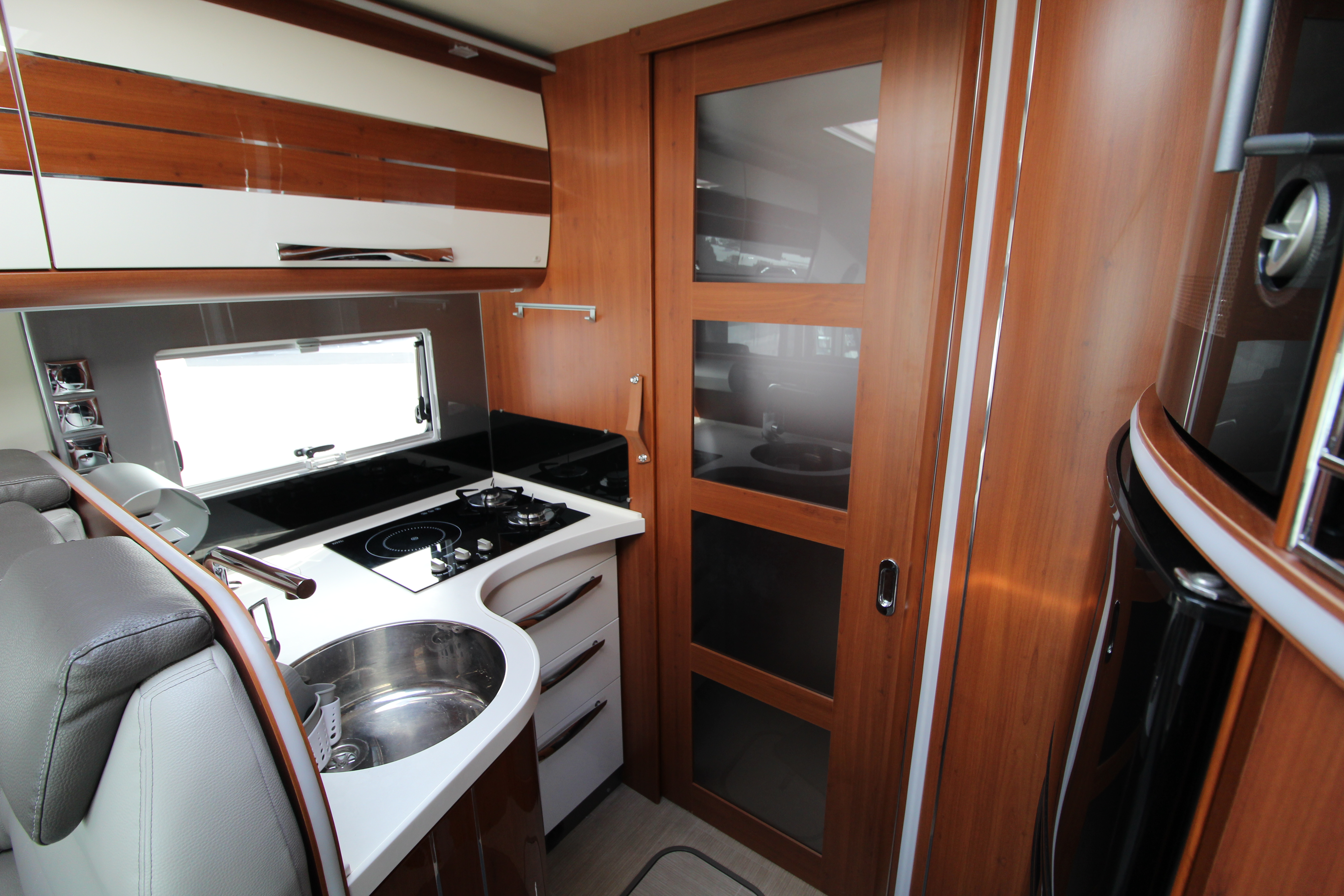 Gourmet kitchen equipped with a 2-burner gas hob, induction hob, Dometic oven/grill, and a massive 150L three-way fridge/freezer and ample storage cupboards for your culinary items.