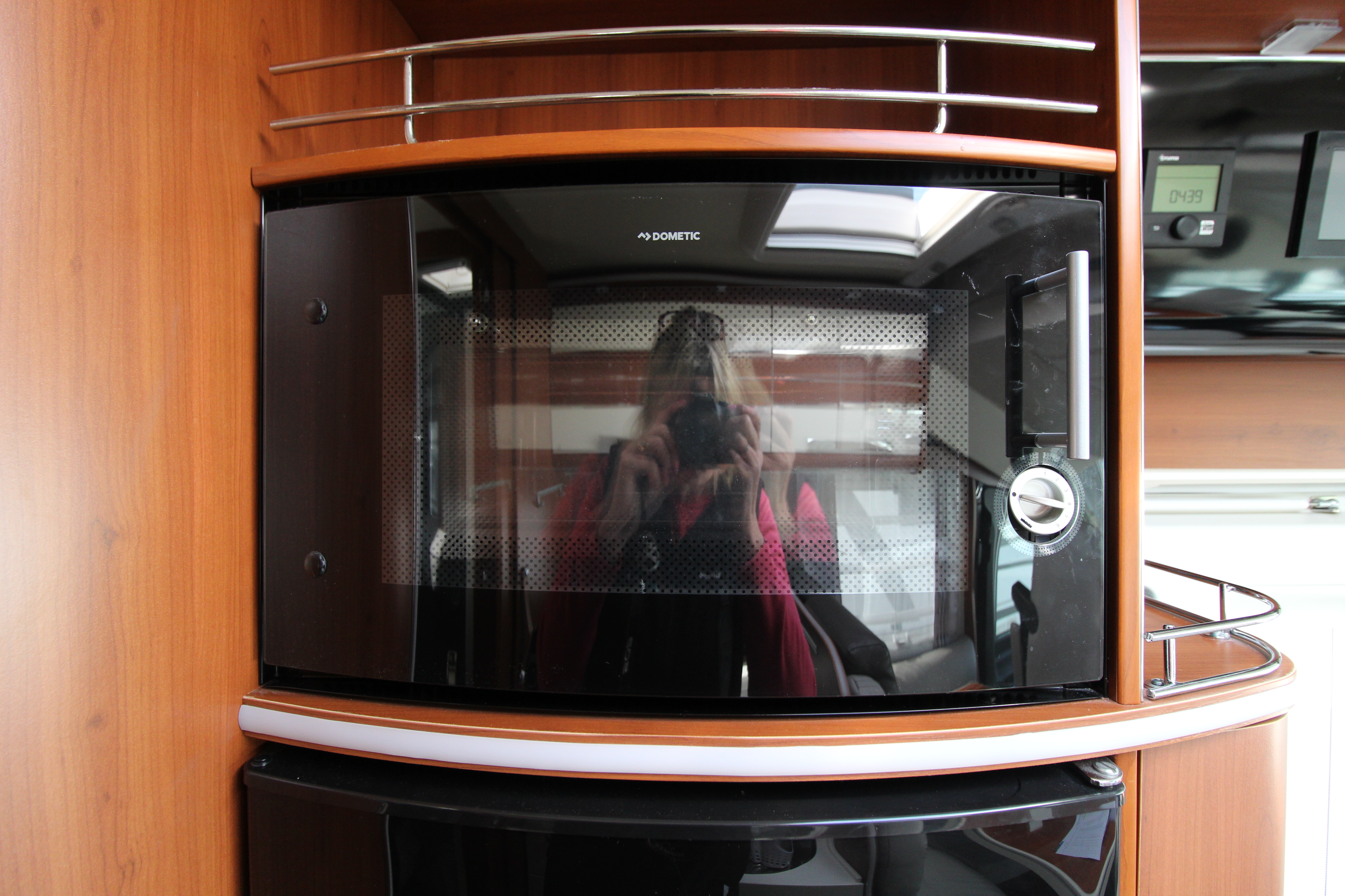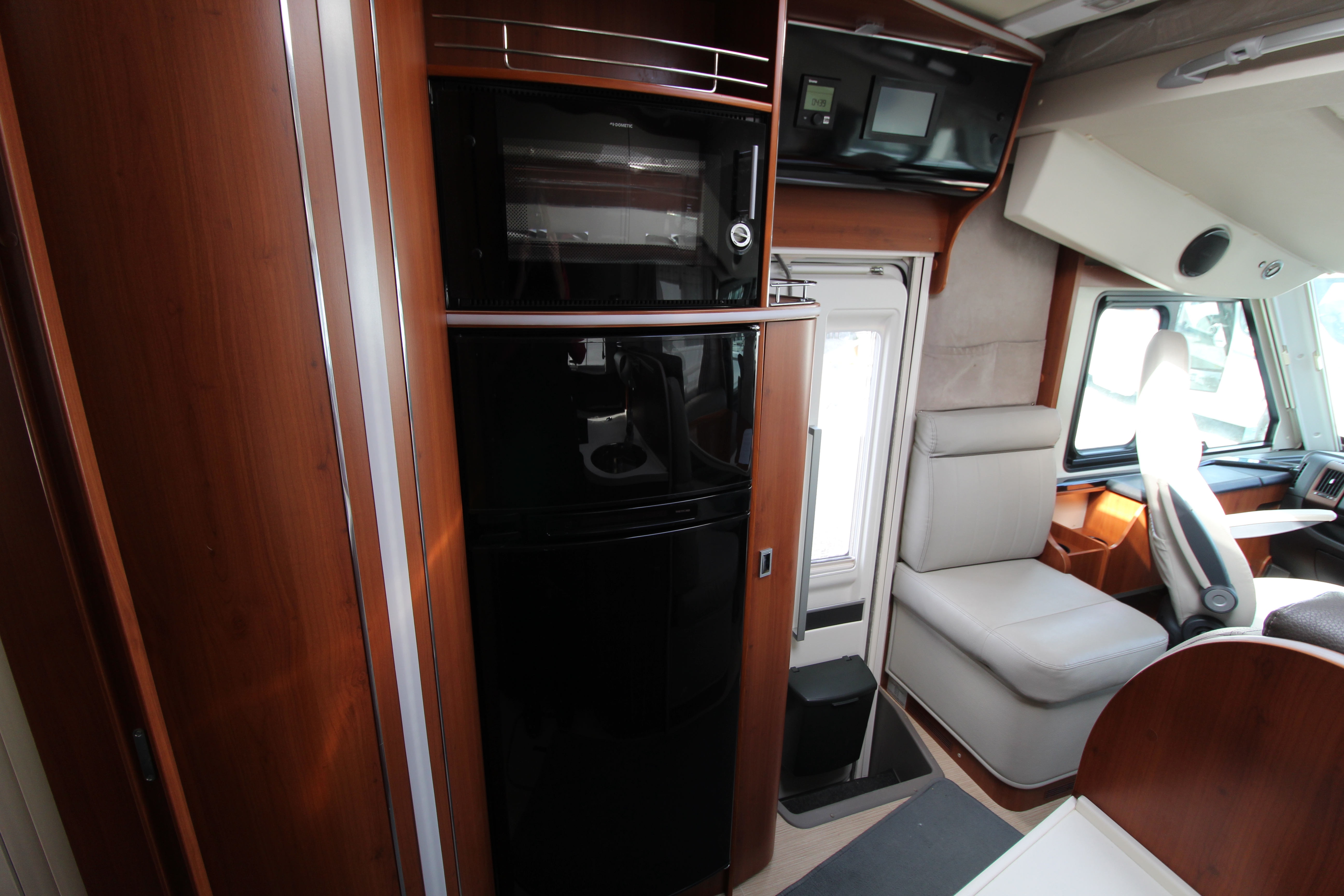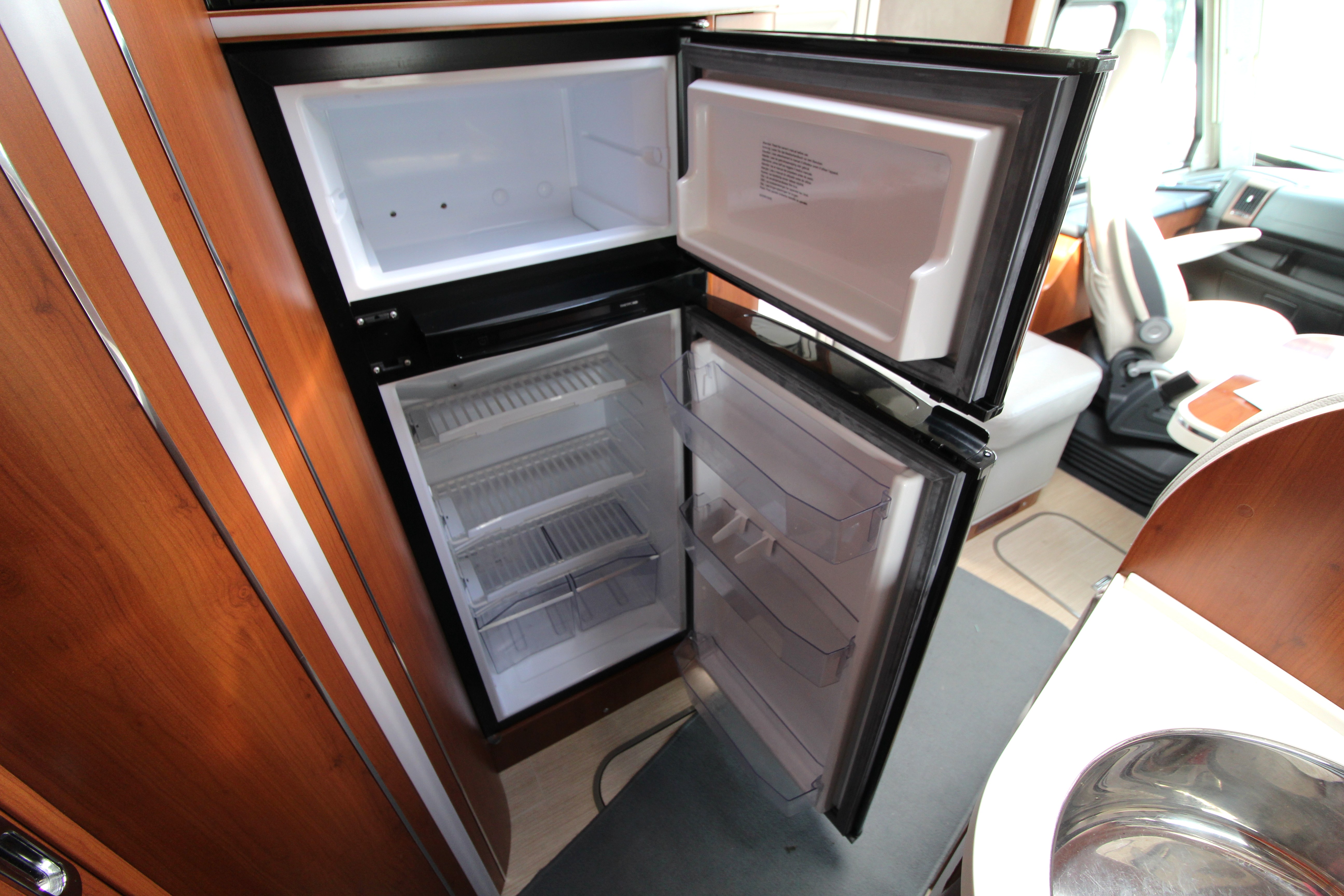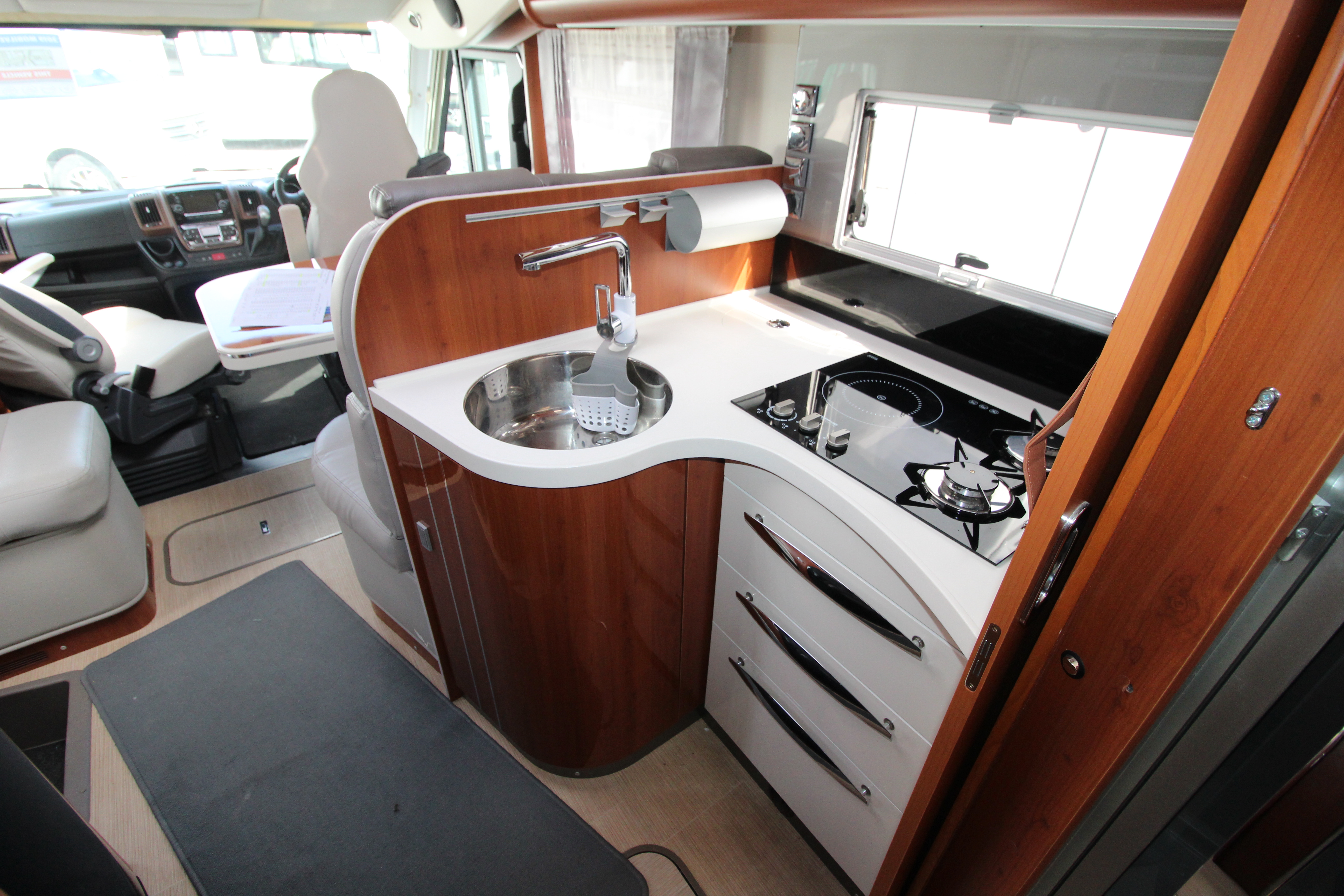Gourmet kitchen equipped with a 2-burner gas hob, induction hob, Dometic oven/grill, and a massive 150L three-way fridge/freezer and ample storage cupboards for your culinary items.