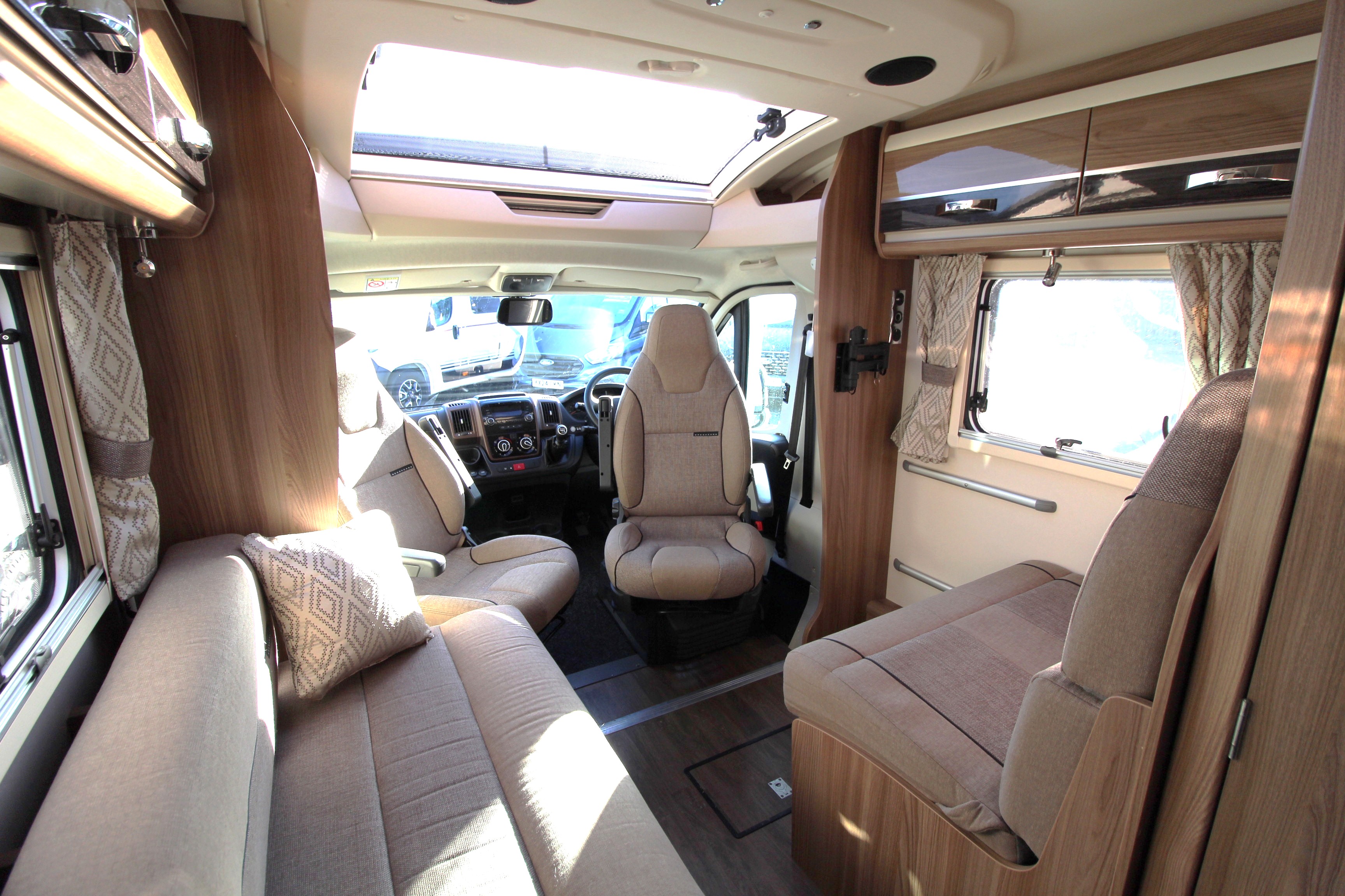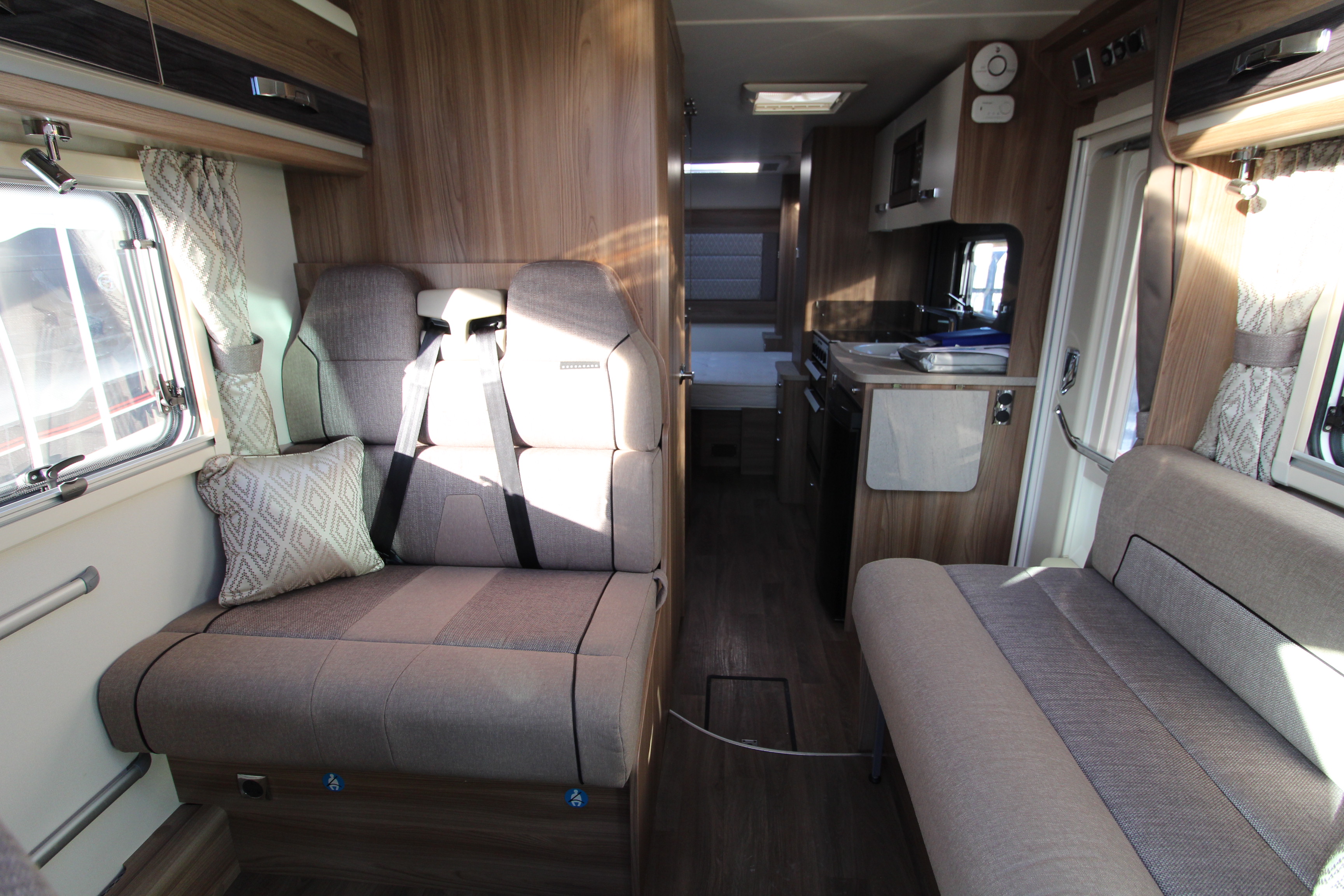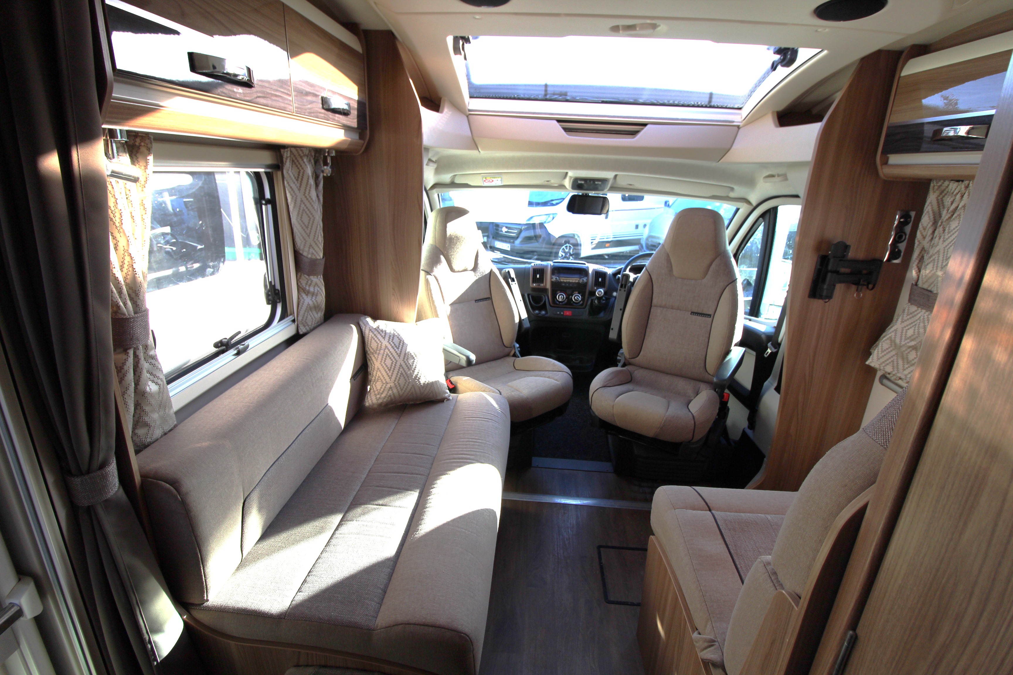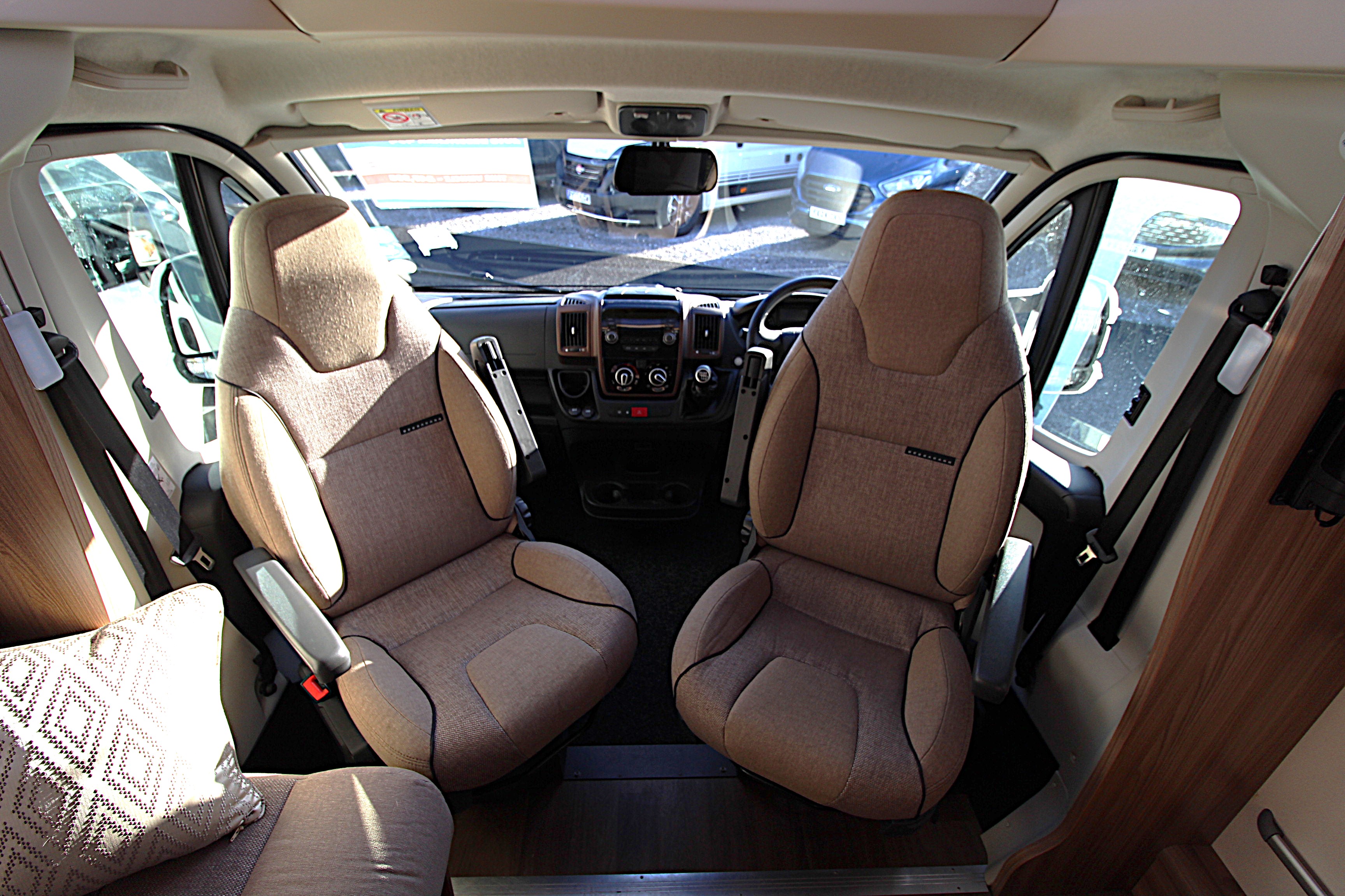 Additional features include twin side and forward facing bench seats to the lounge area, tv aerial points and brackets to the main living area and bedroom area, cab and window blinds, external electric and gas points.