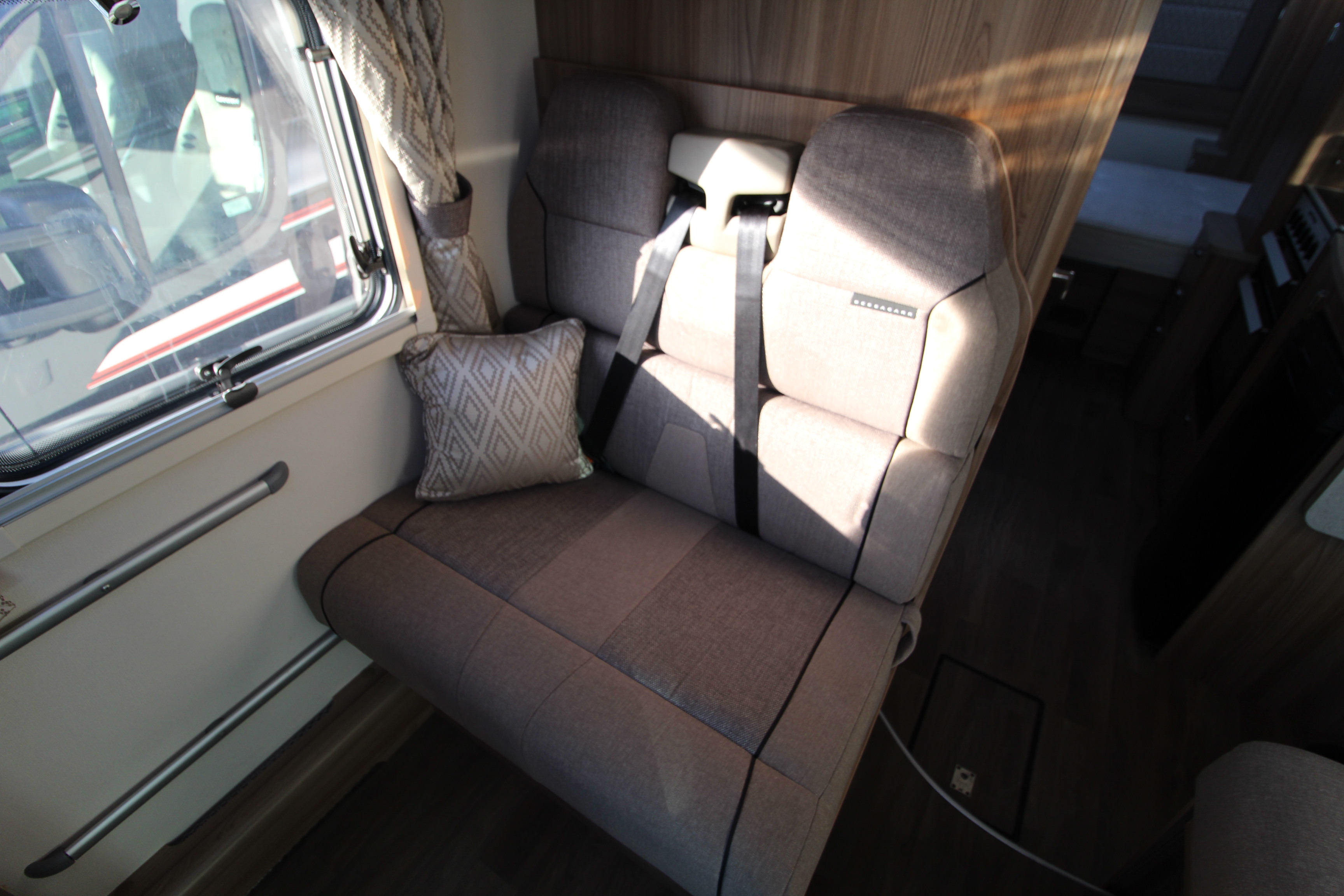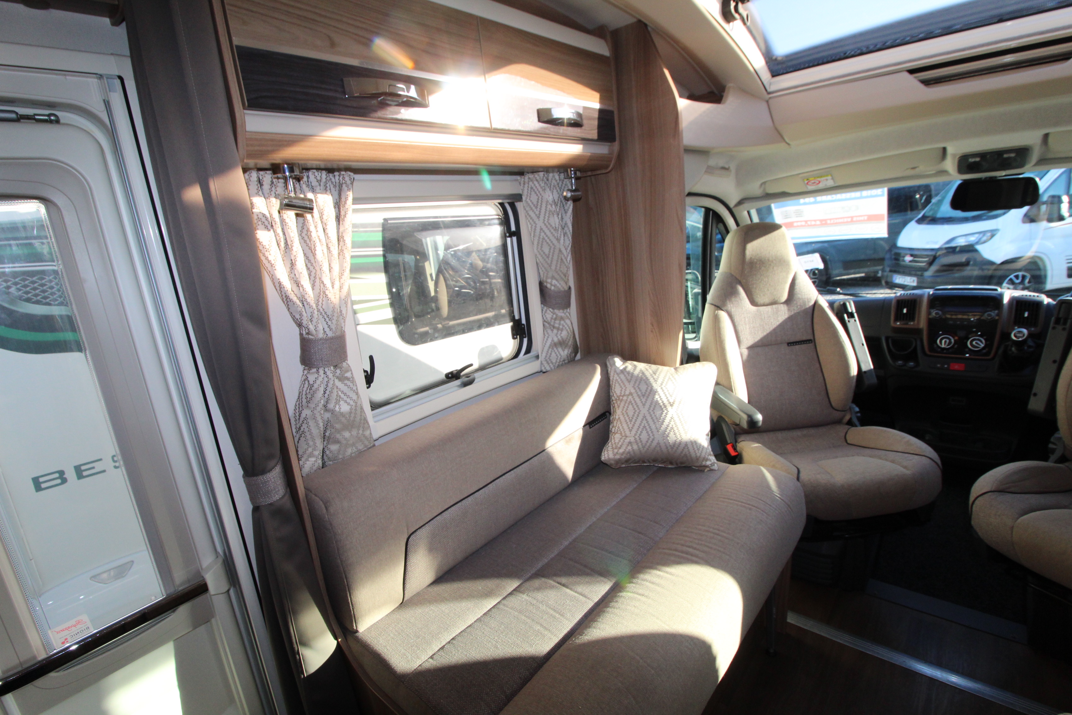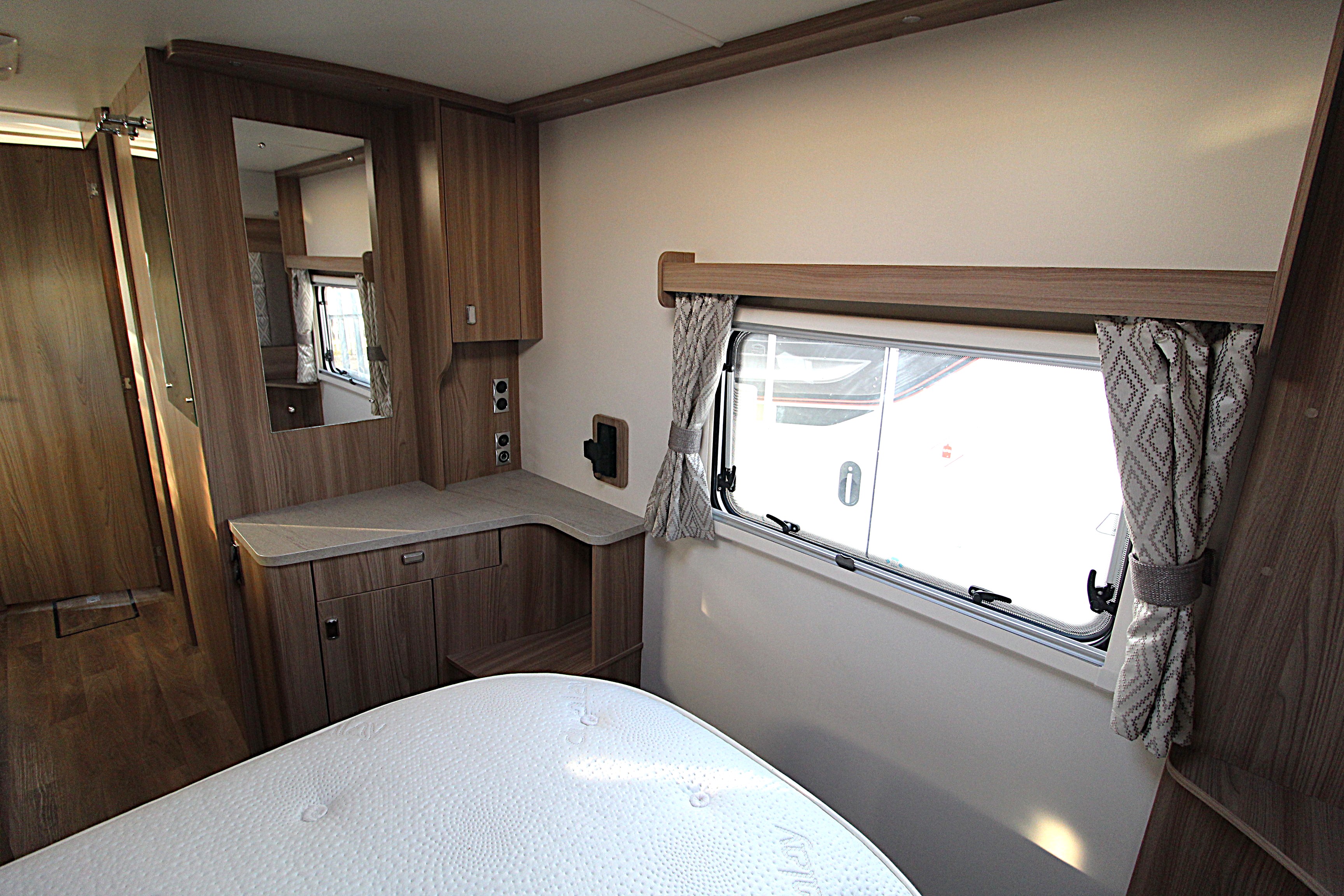 Additional features include twin side and forward facing bench seats to the lounge area, tv aerial points and brackets to the main living area and bedroom area, cab and window blinds, external electric and gas points.