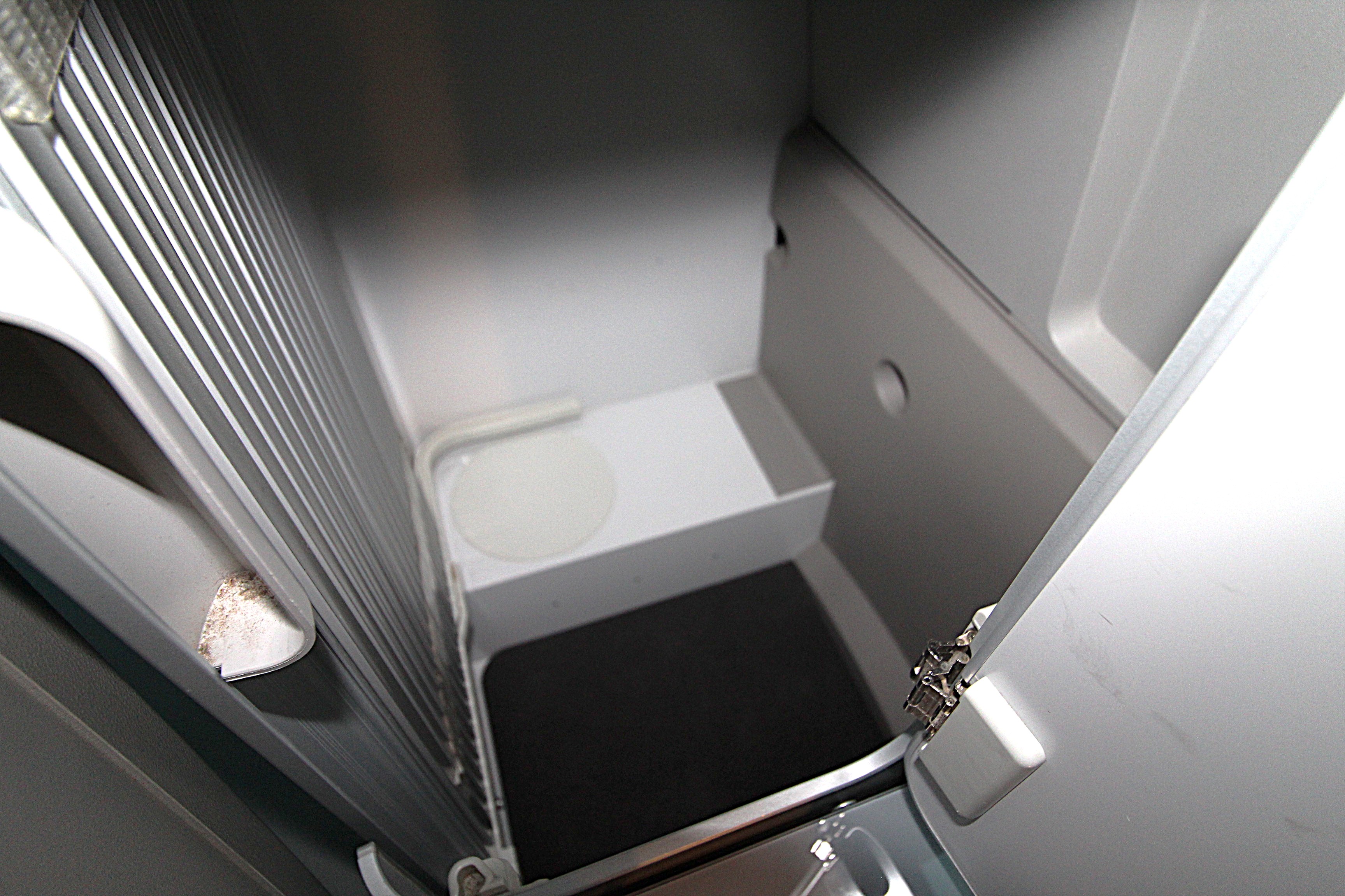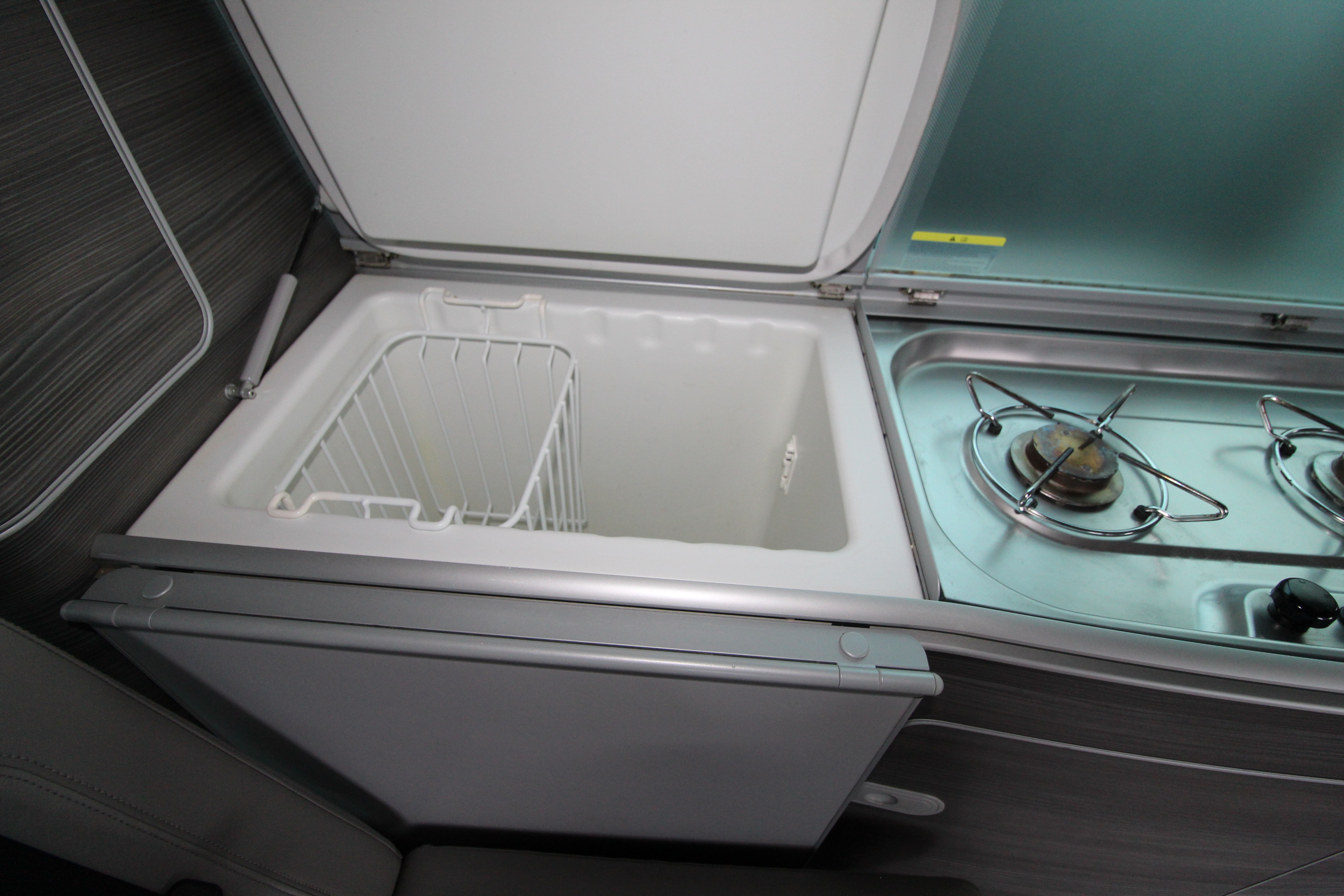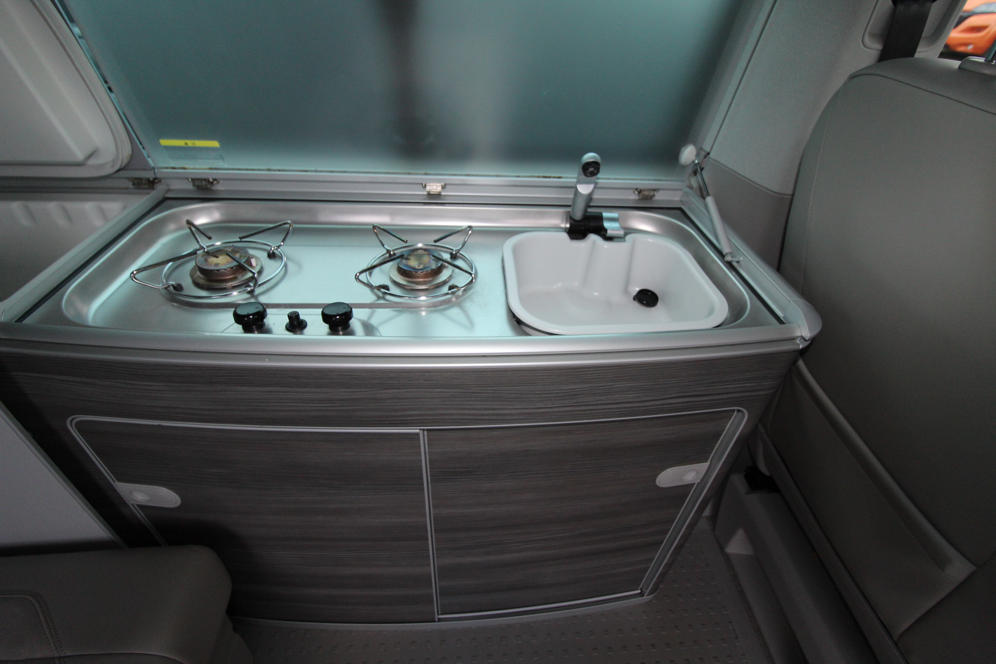 Integrated Kitchenette: Features a high-quality stainless steel two-burner gas hob, sink with fresh and wastewater tanks, a generous 42L cool box and ample storage.