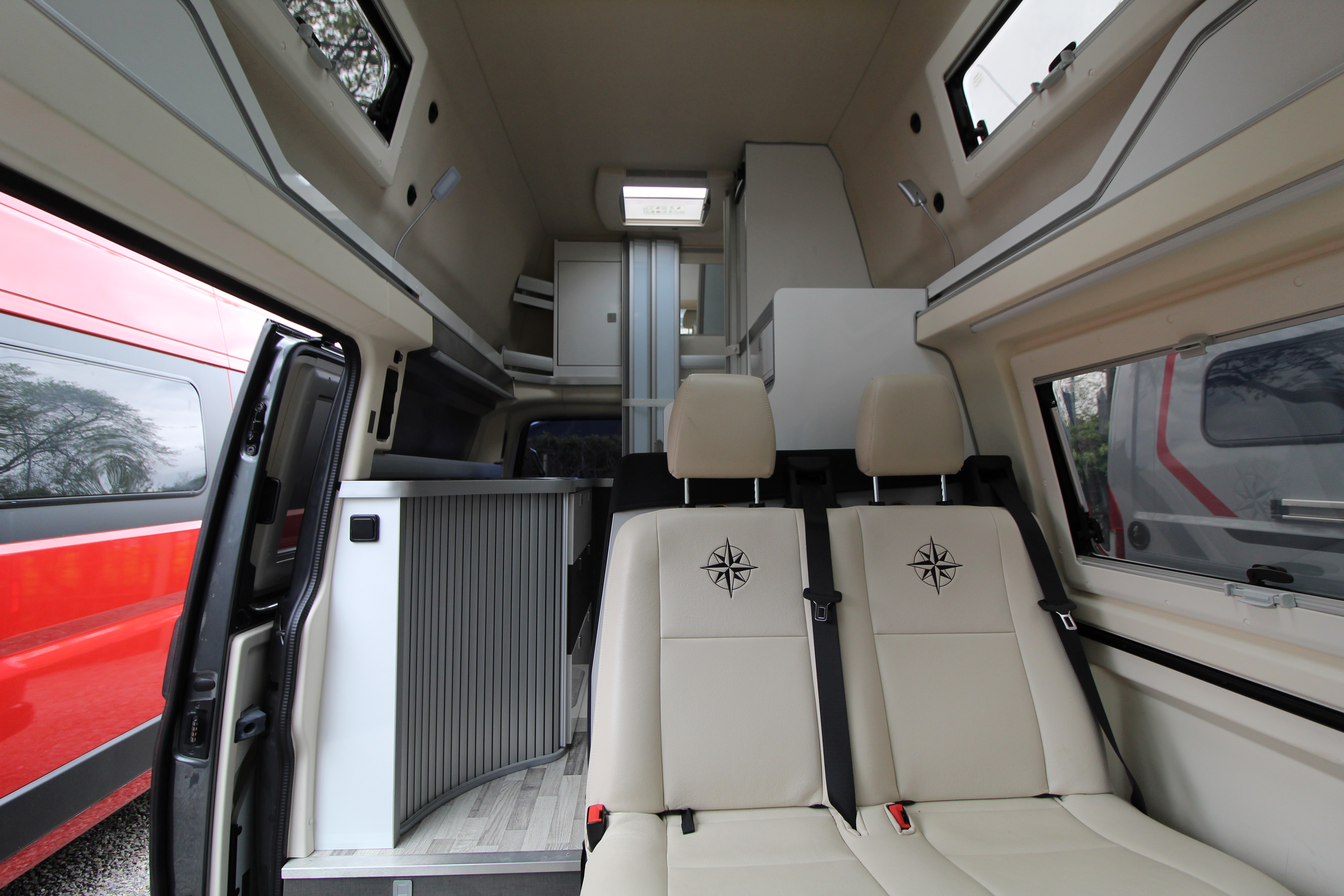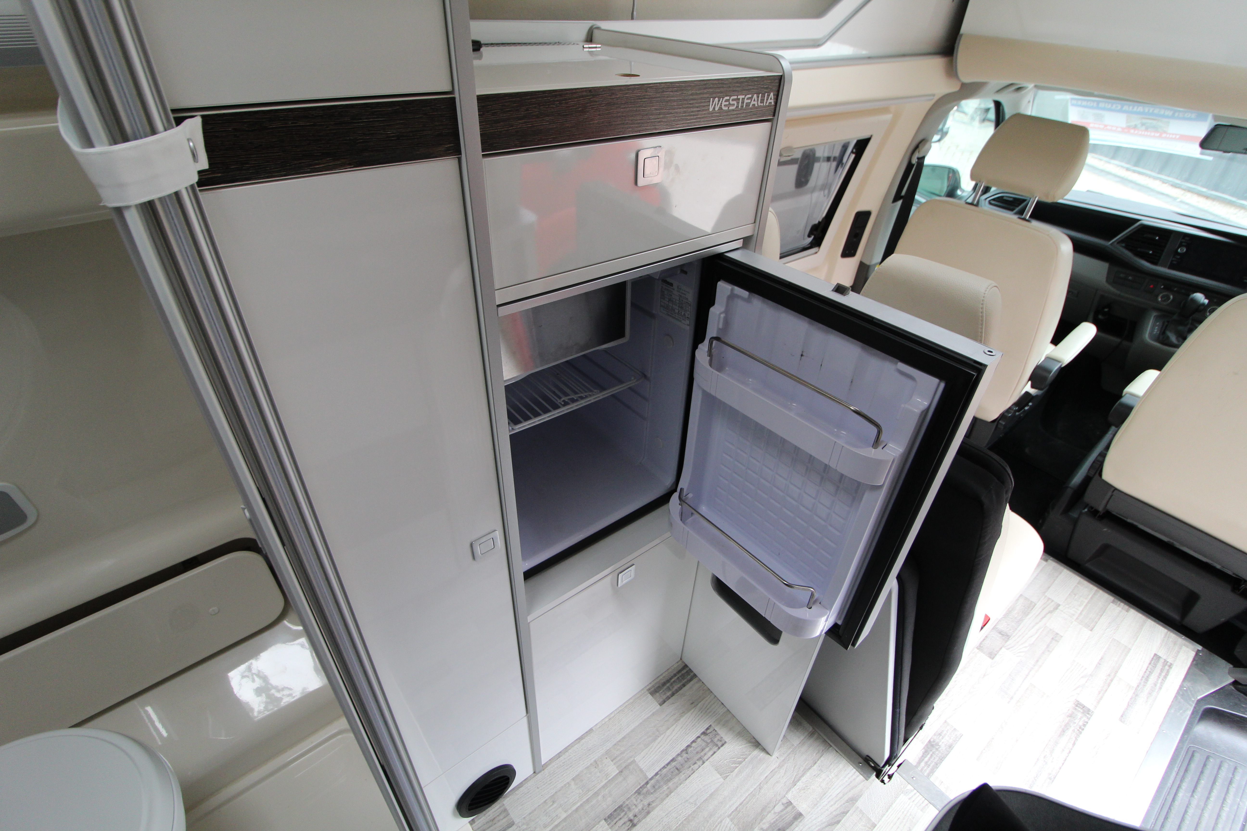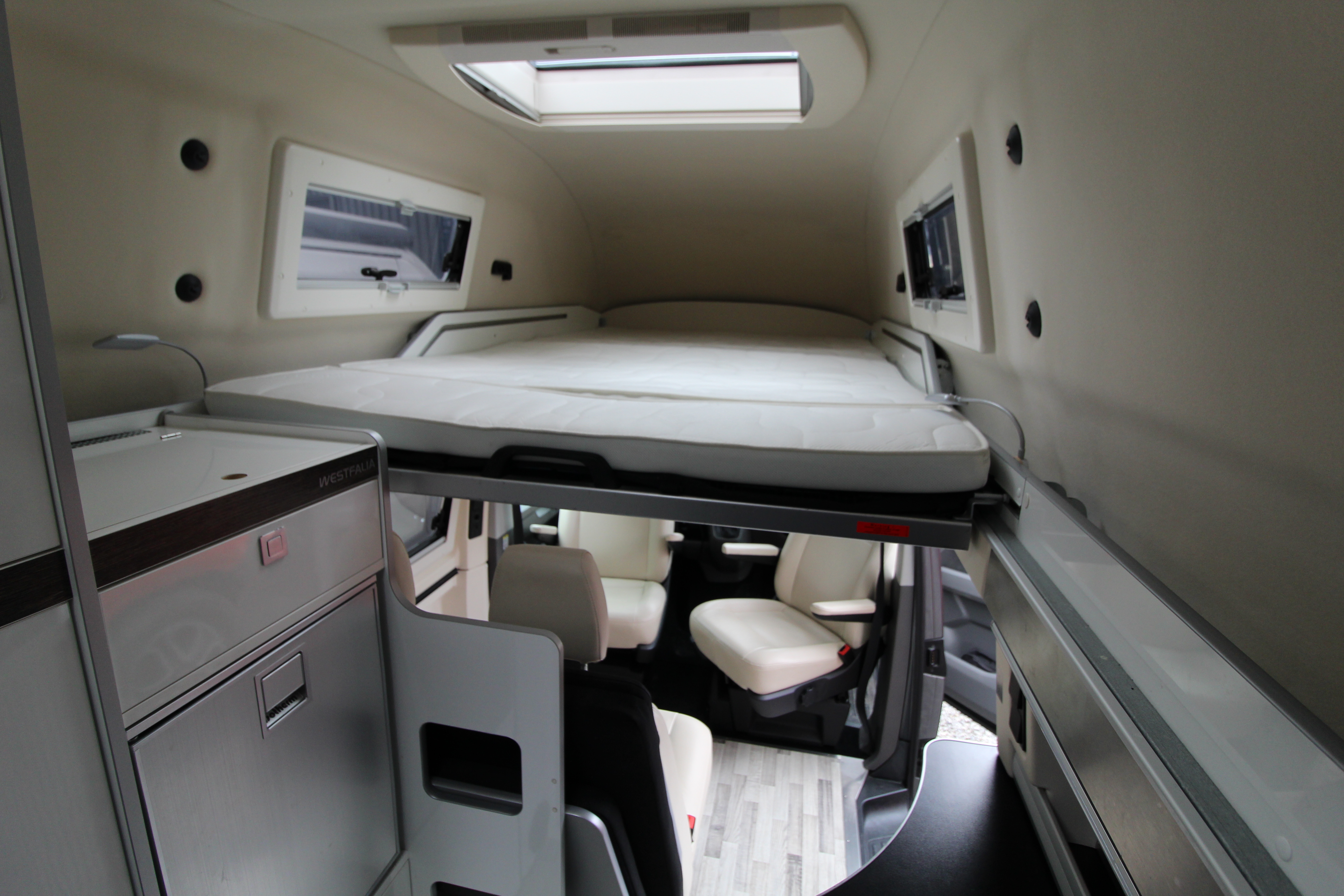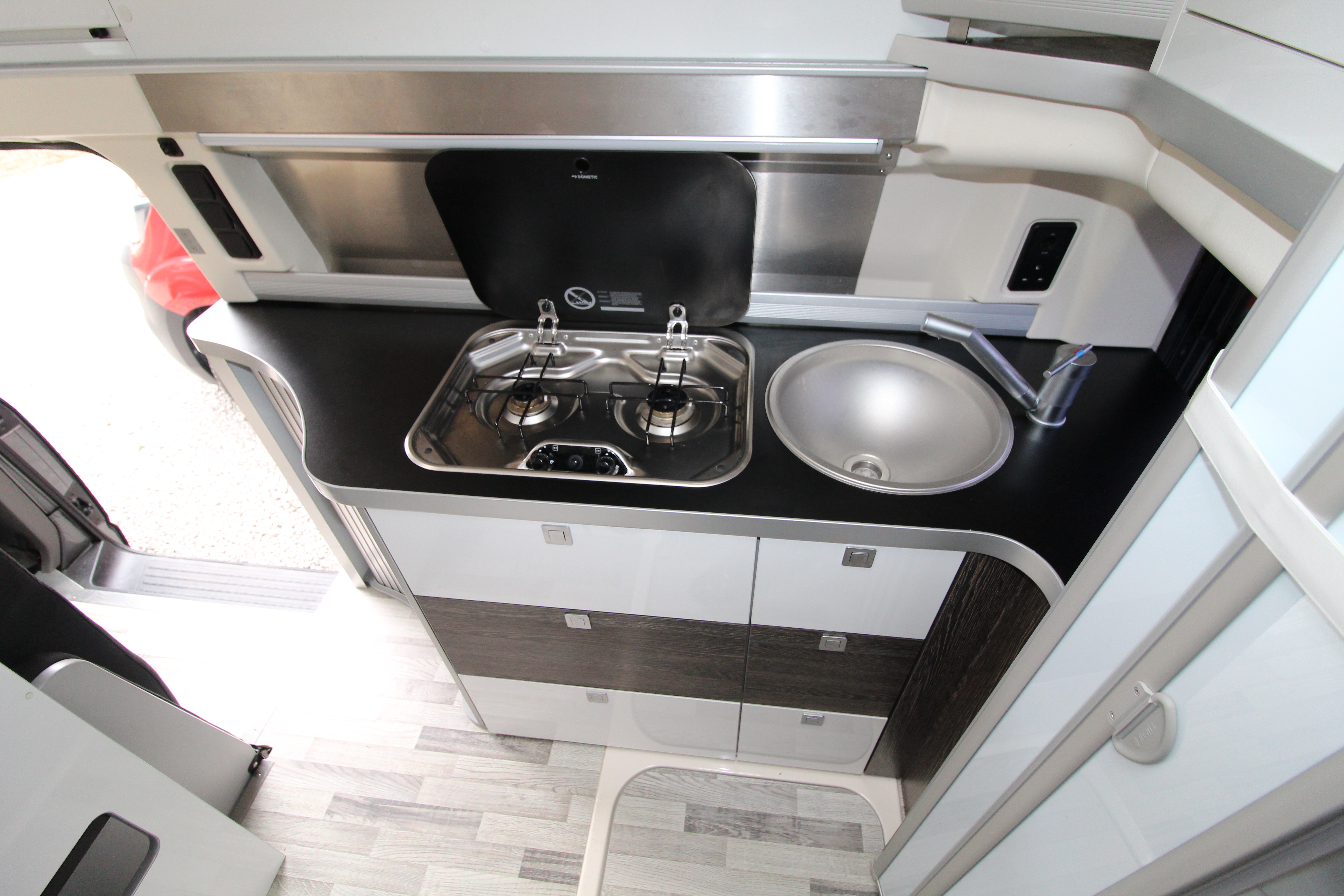 With a generous lounge area, swivel cab seats and the ability to walk around inside making comfort priority, this vehicle also offers a 2-burner hob, sink, fridge, along with ample storage cupboards and work surface.