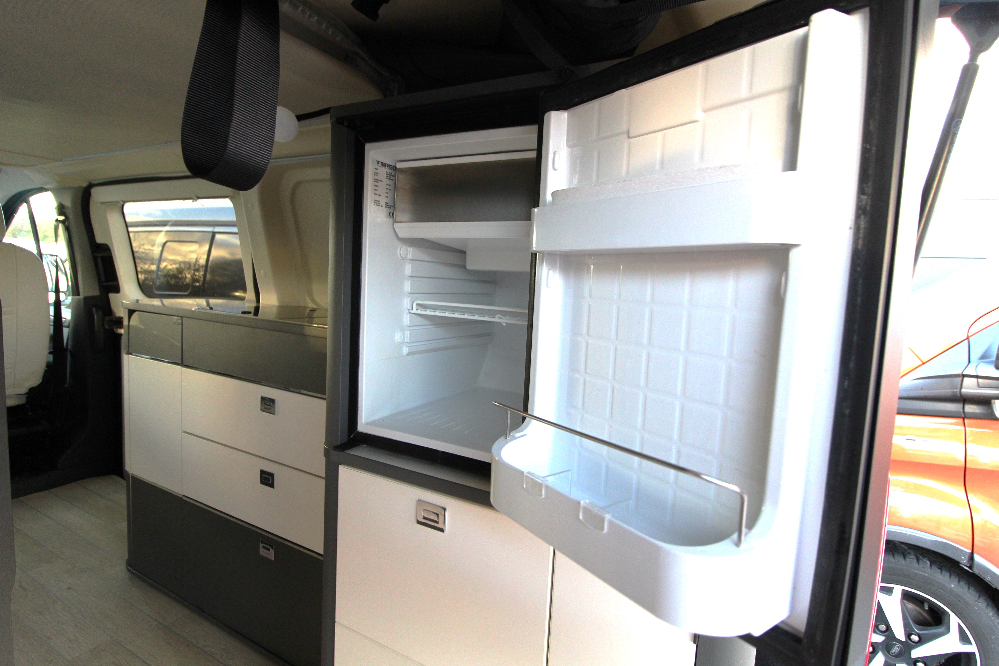 Kitchen facilities include a two-burner gas hob, stainless steel sink, generous fridge and ample storage drawers.
