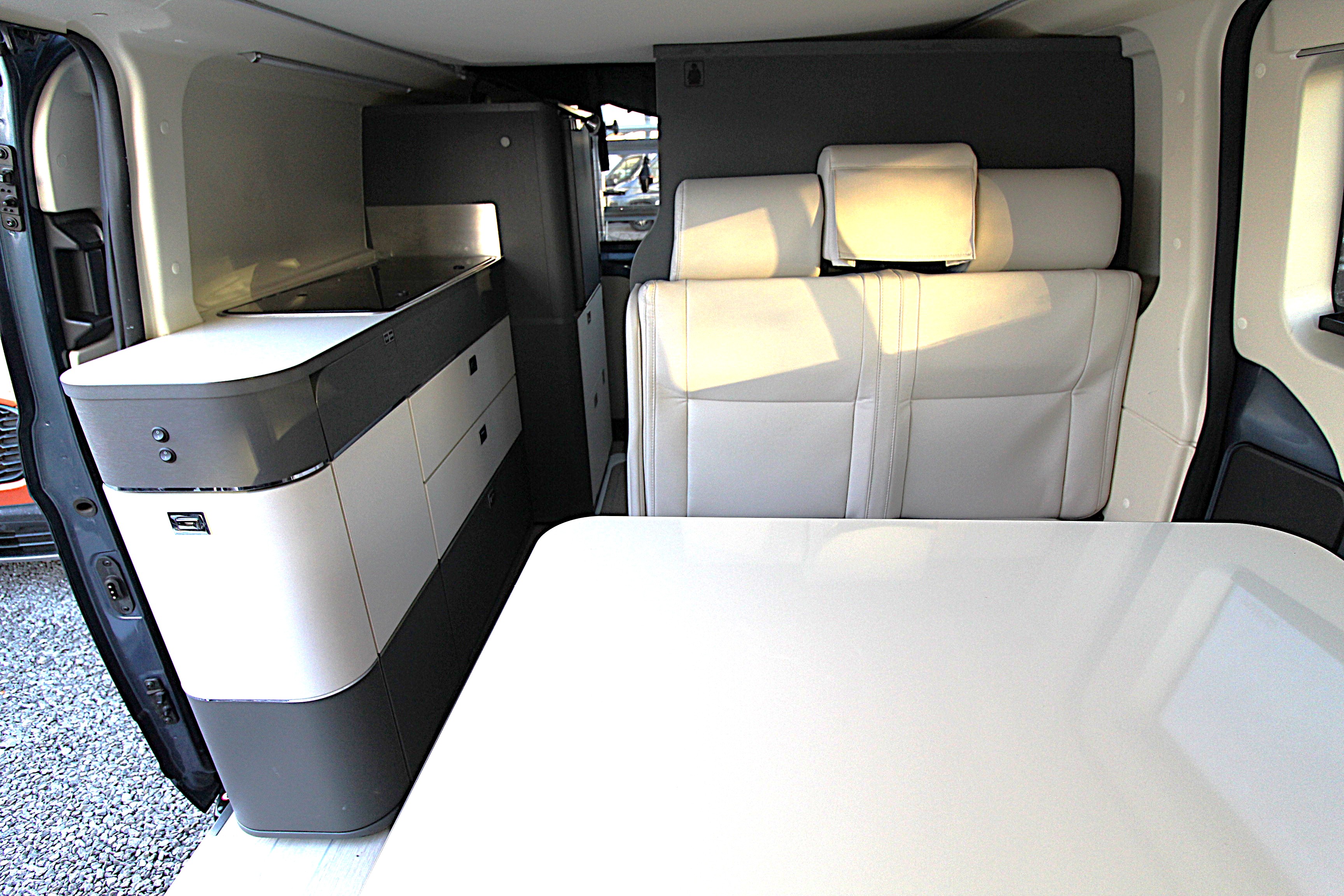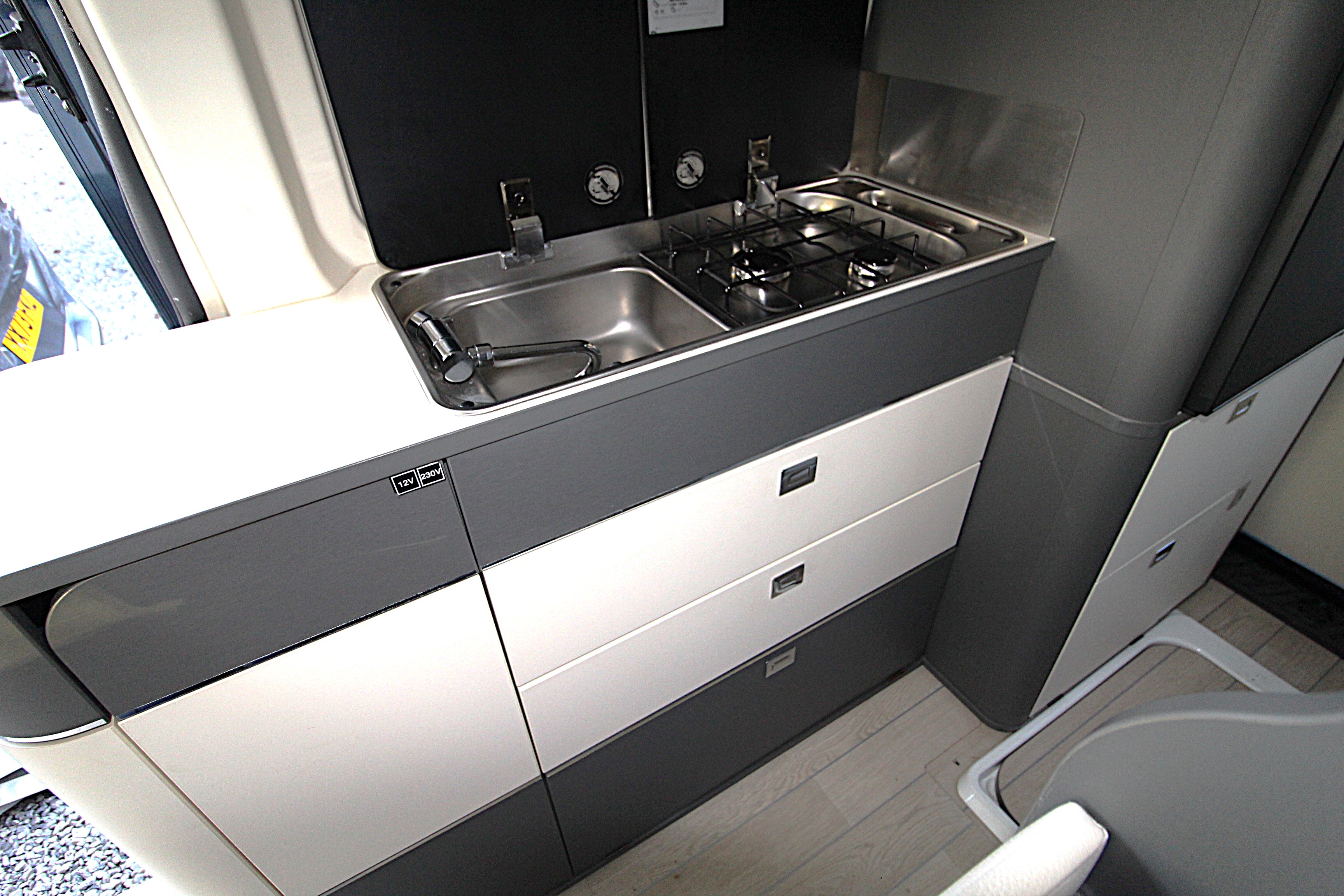 Swivel cab seats enhance the lounge area with its twin bench seat and removable table and pouffe. Sliding opening habitation doors on either side of the lounge are perfect for access purposes and ideal ona hot day. The lounge area converts to a sleeping area for 2 people while the pop-top roof accommodates another 2 people.