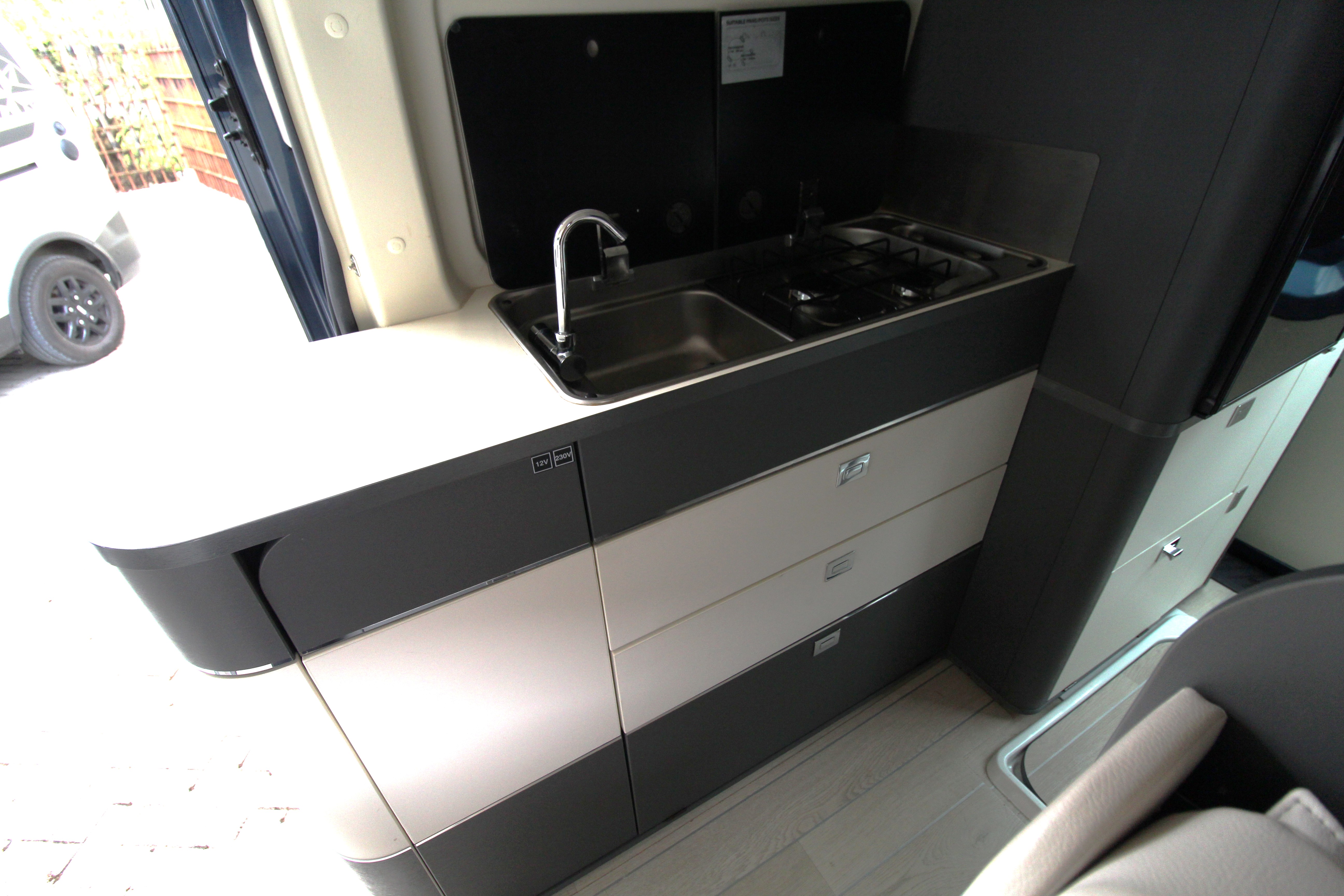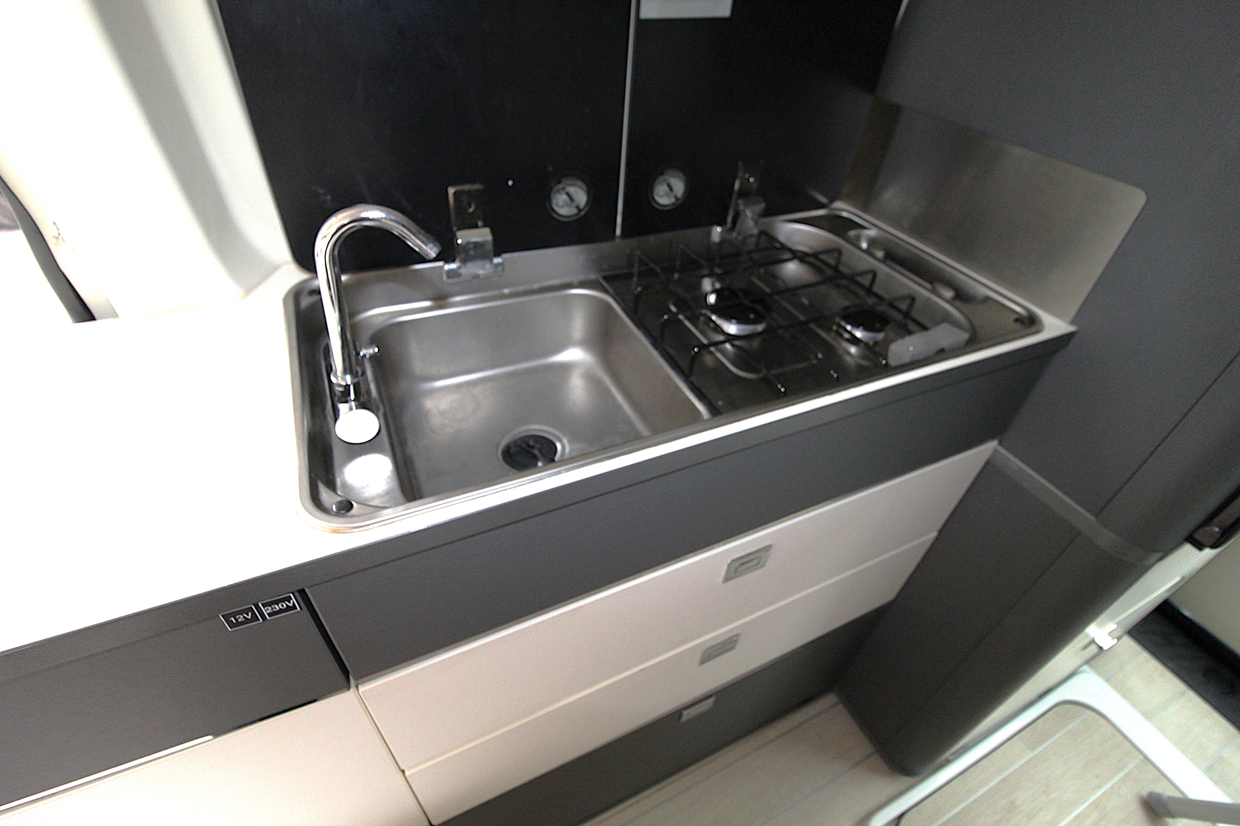 Kitchen facilities include a two-burner gas hob, stainless steel sink, generous fridge and ample storage drawers.