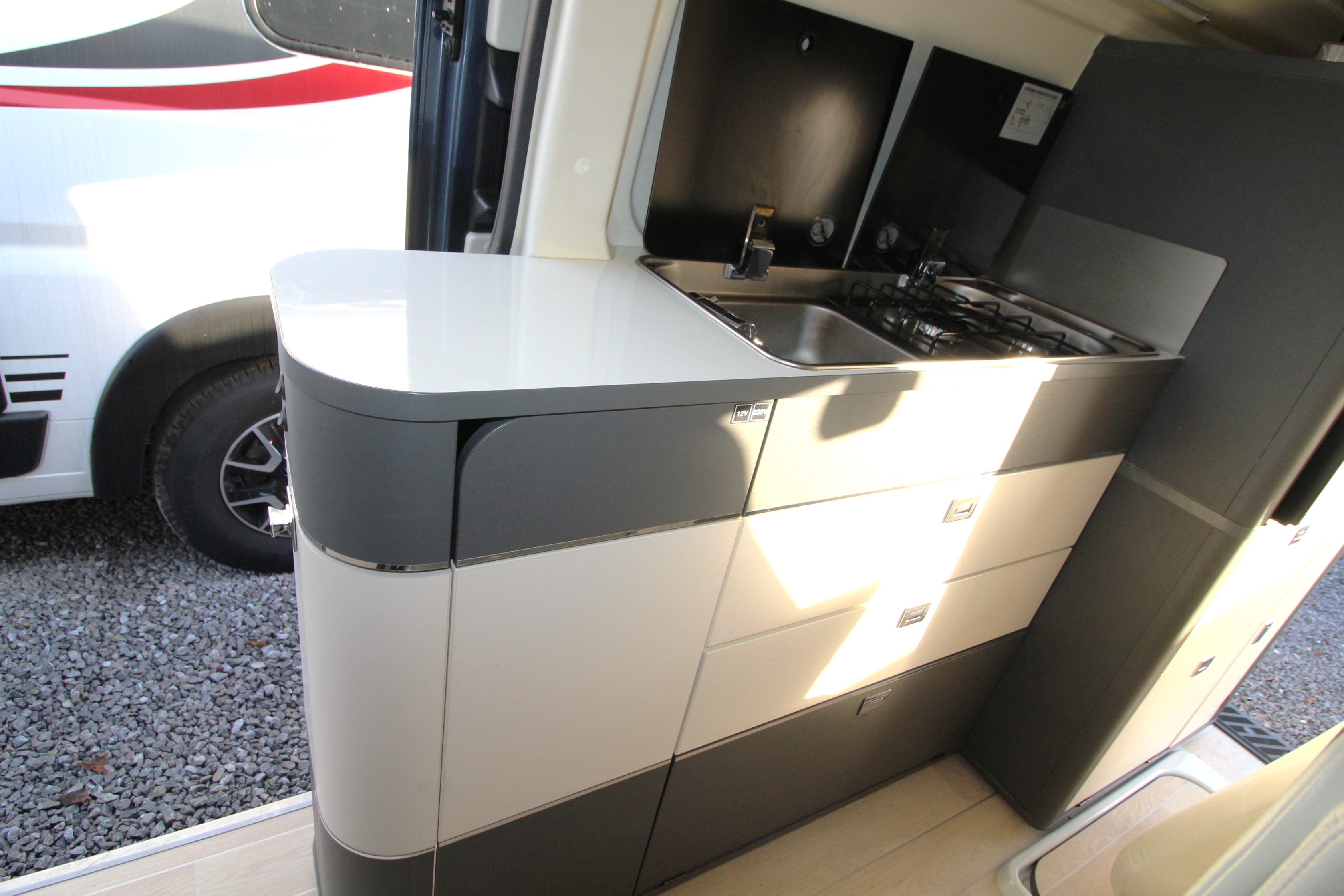 Swivel cab seats enhance the lounge area with its twin bench seat and removable table and pouffe. Sliding opening habitation doors on either side of the lounge are perfect for access purposes and ideal ona hot day. The lounge area converts to a sleeping area for 2 people while the pop-top roof accommodates another 2 people.