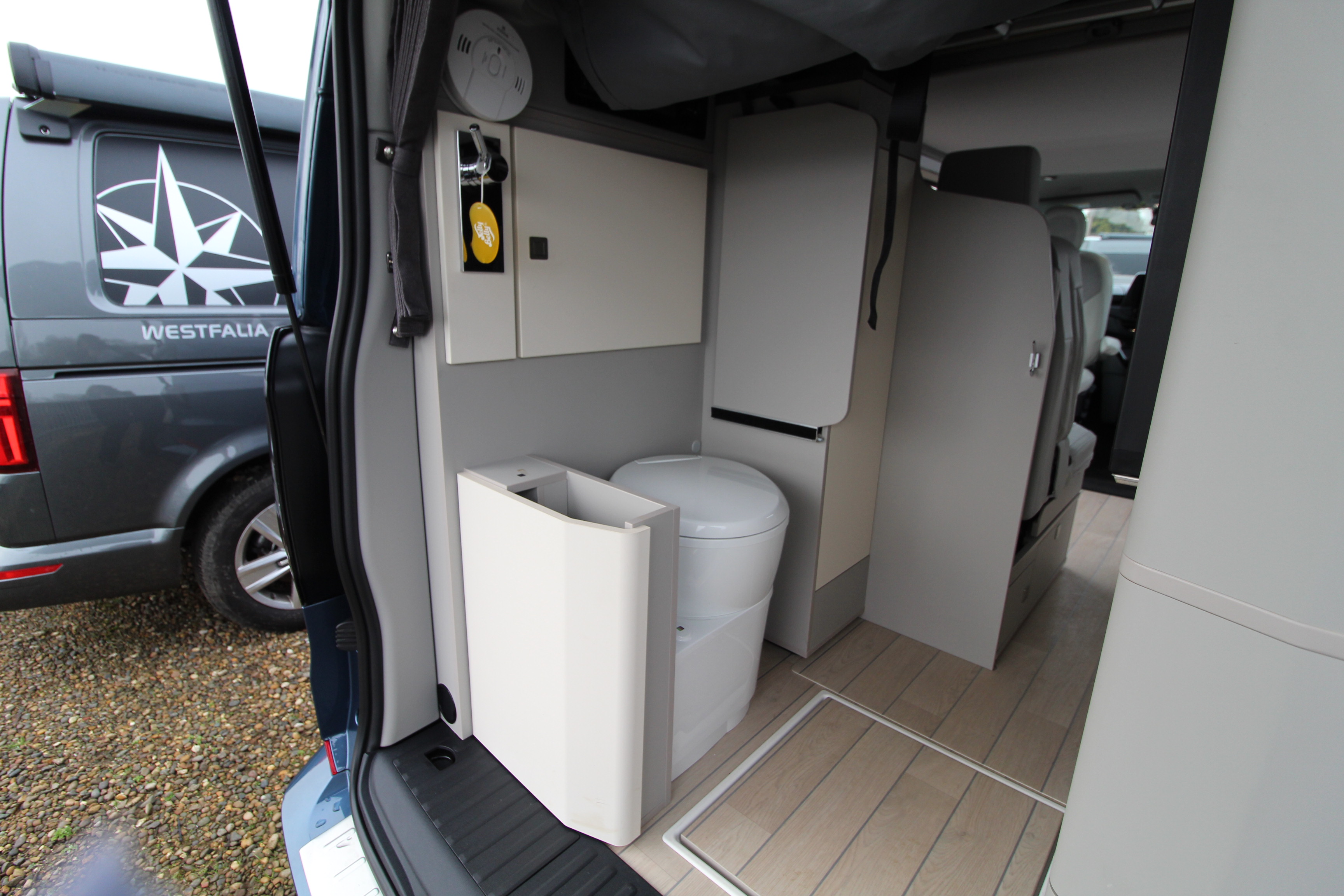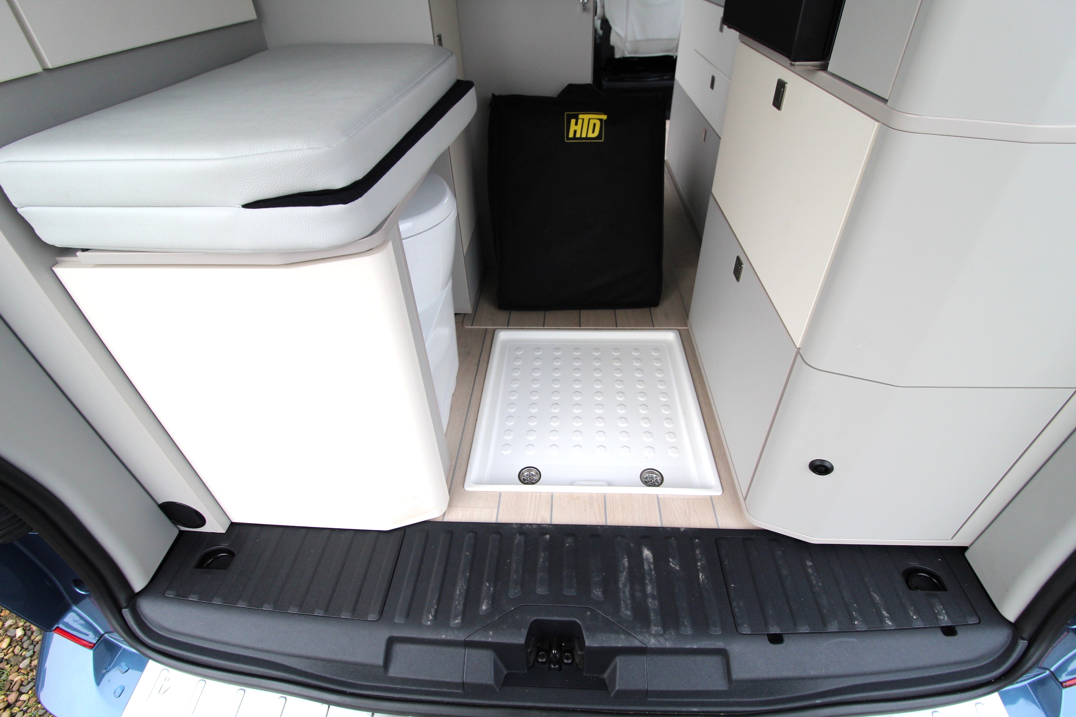 Bathroom: Rare integrated indoor shower area with privacy curtain and a fixed cassette toilet.