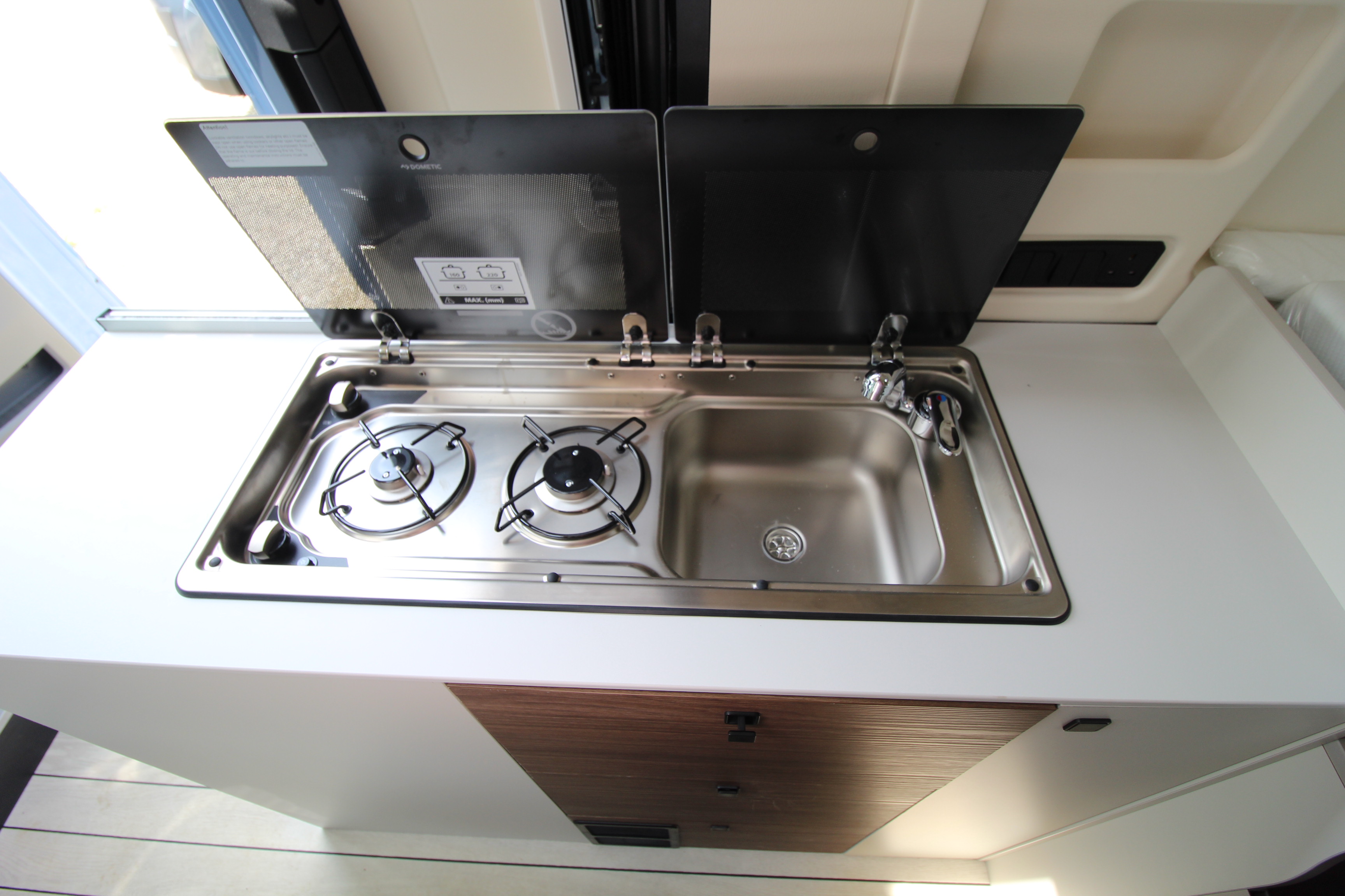 The Sven Hedin kitchen incorporates an ingenious refrigerator with a 90 litre capacity. It is located at the end of the kitchen unit and is also easily accessible from the outside (opening on both sides)