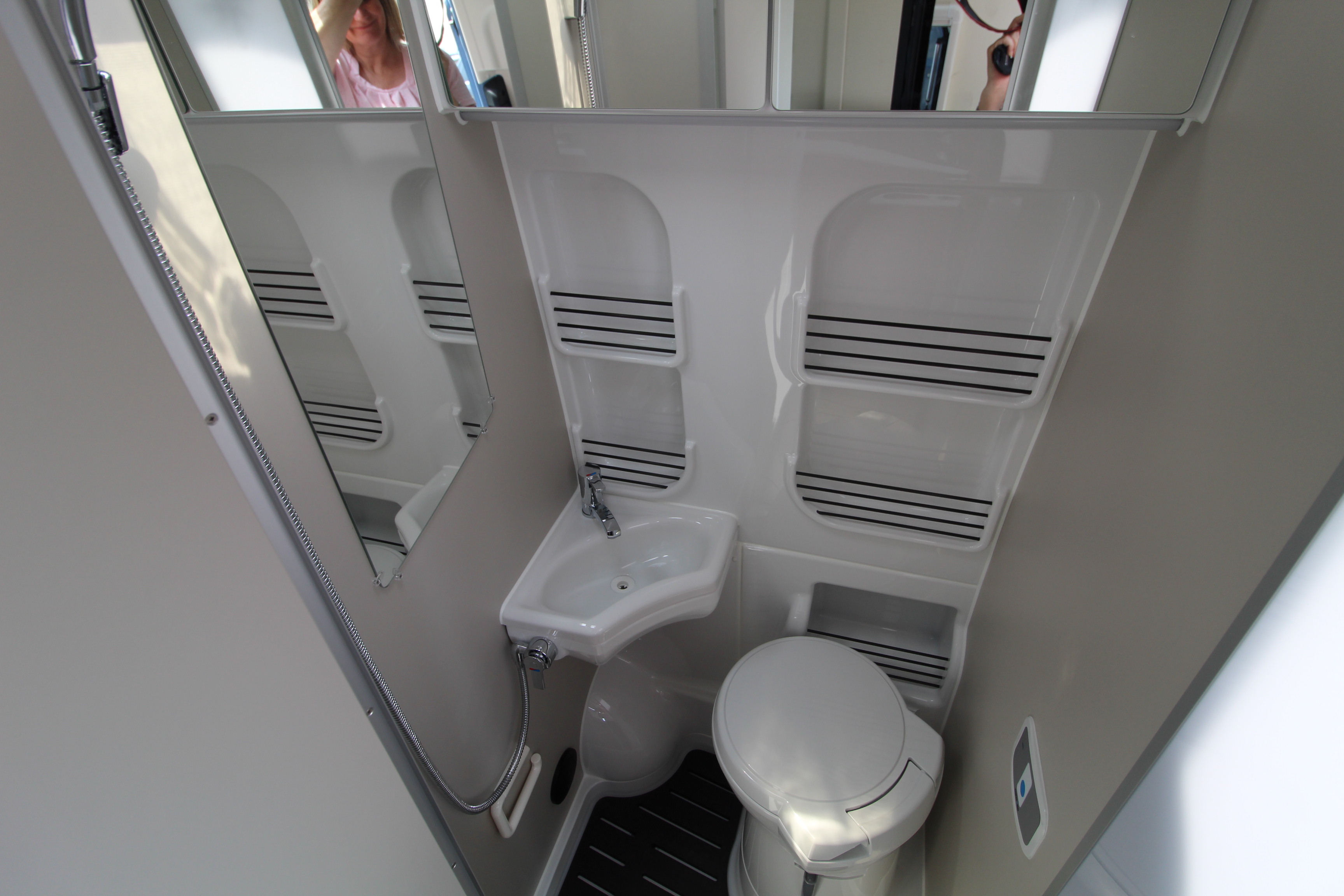 This van features a large bathroom with plenty of storage space. It includes a shower, washbasin, removable toilet, and mirrored cupboards.